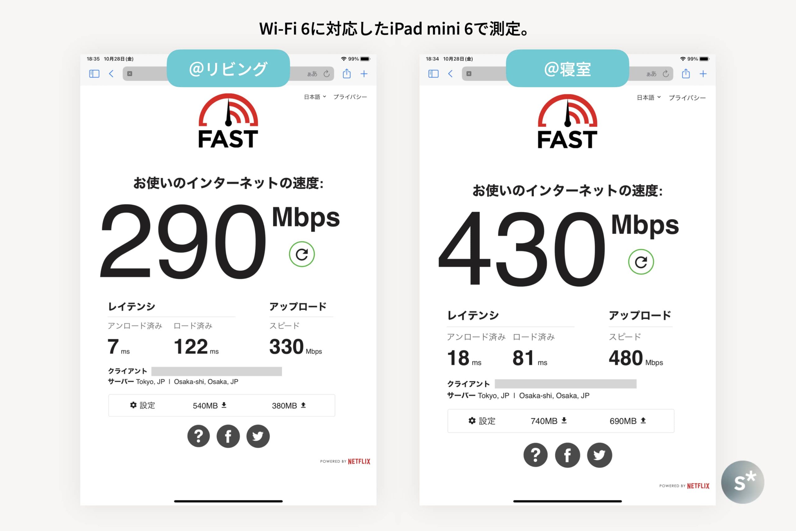 そして、Wi-Fi接続したiPad mini 6。これはWi-Fi 6に対応しているので、無線接続ながらもそれなりの結果が望めるはず。リビングと寝室の2か所で検証しました。