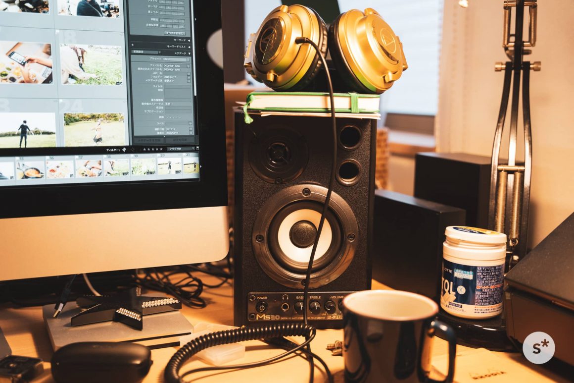 また、ヘッドホンはMacに直接ではなく、スピーカーにつなぐことにしています。そうすればいちいち配線を入れ替えなくていいので。ヘッドホン自体はオーディオテクニカの「ATH-PRO700」のゴールドモデルを使っています。これも古いです。