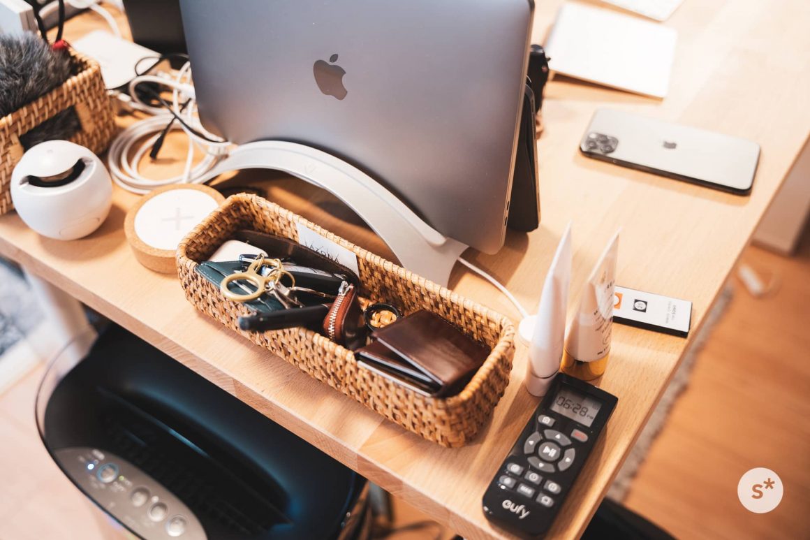 デスク左側には、MacBook ProやiPad Proといったポータブルデバイスと、財布やカギなどの置き場を作っています。Apple WatchやAirPodsのワイヤレス充電もここに集約。このエリアで身支度が整うようにしています。