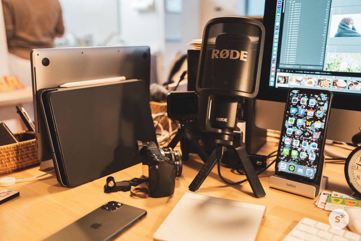 また、左側にはRODEのマイク「NT-USB」を置いています。2019年末に購入したものの、あまり使えていません。動画作ってないからね。