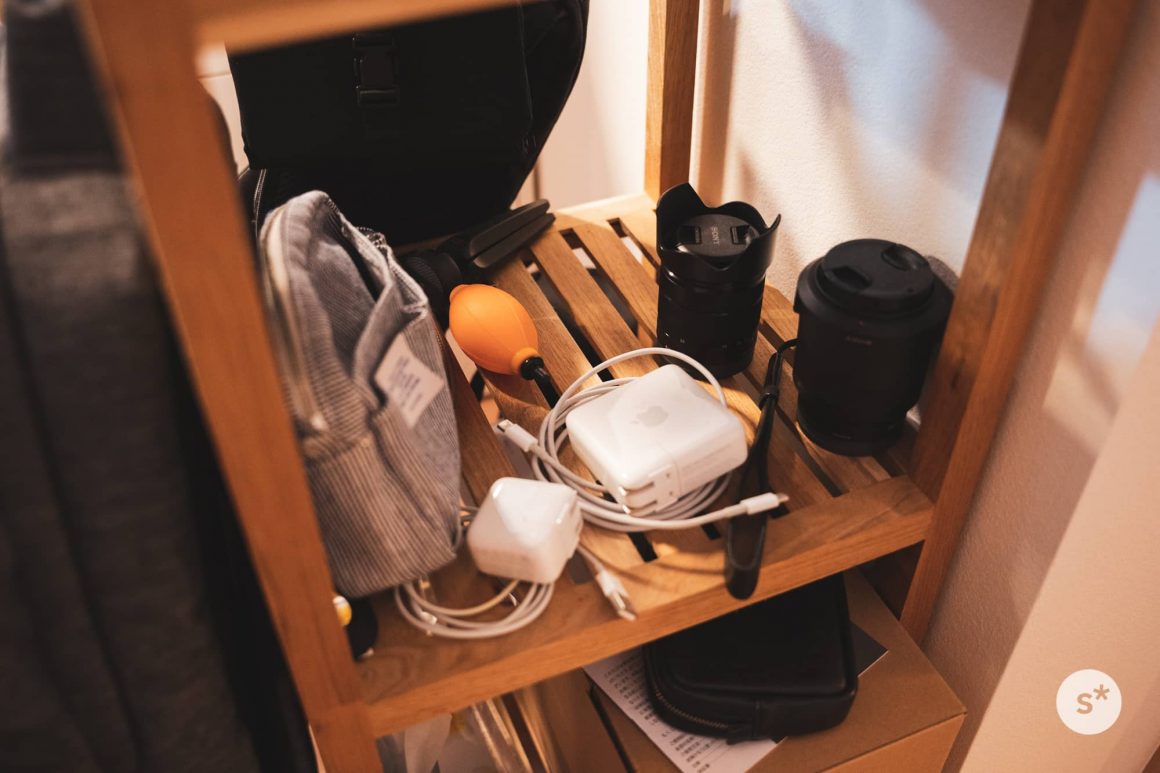 中にはMacの充電器やカメラのレンズを雑多に置いています。これは整理したい(と思いながら放置してる)。