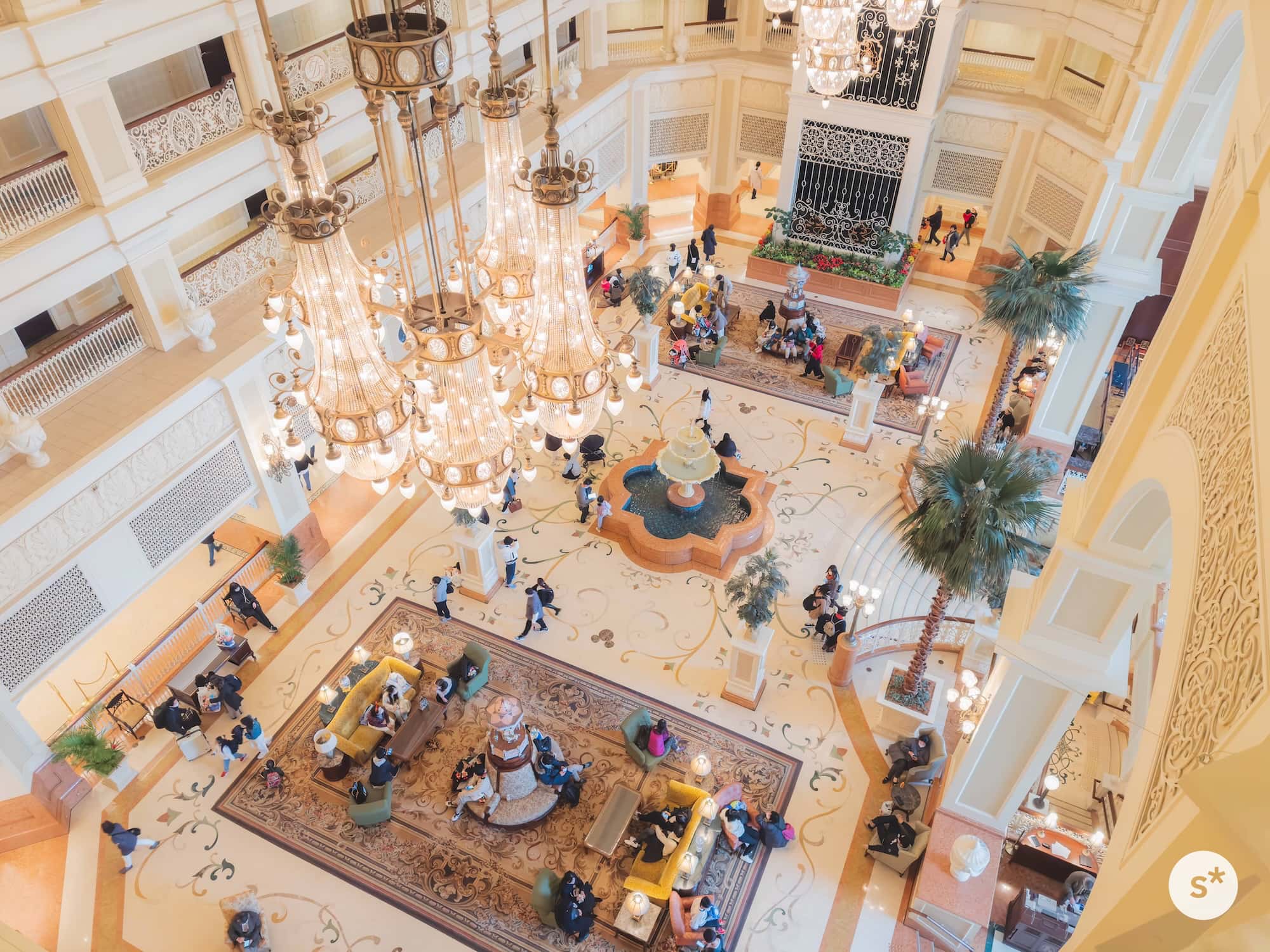 泊まっていた8階からロビーを見下ろすとこんな感じ。シャンデリアの迫力よ。