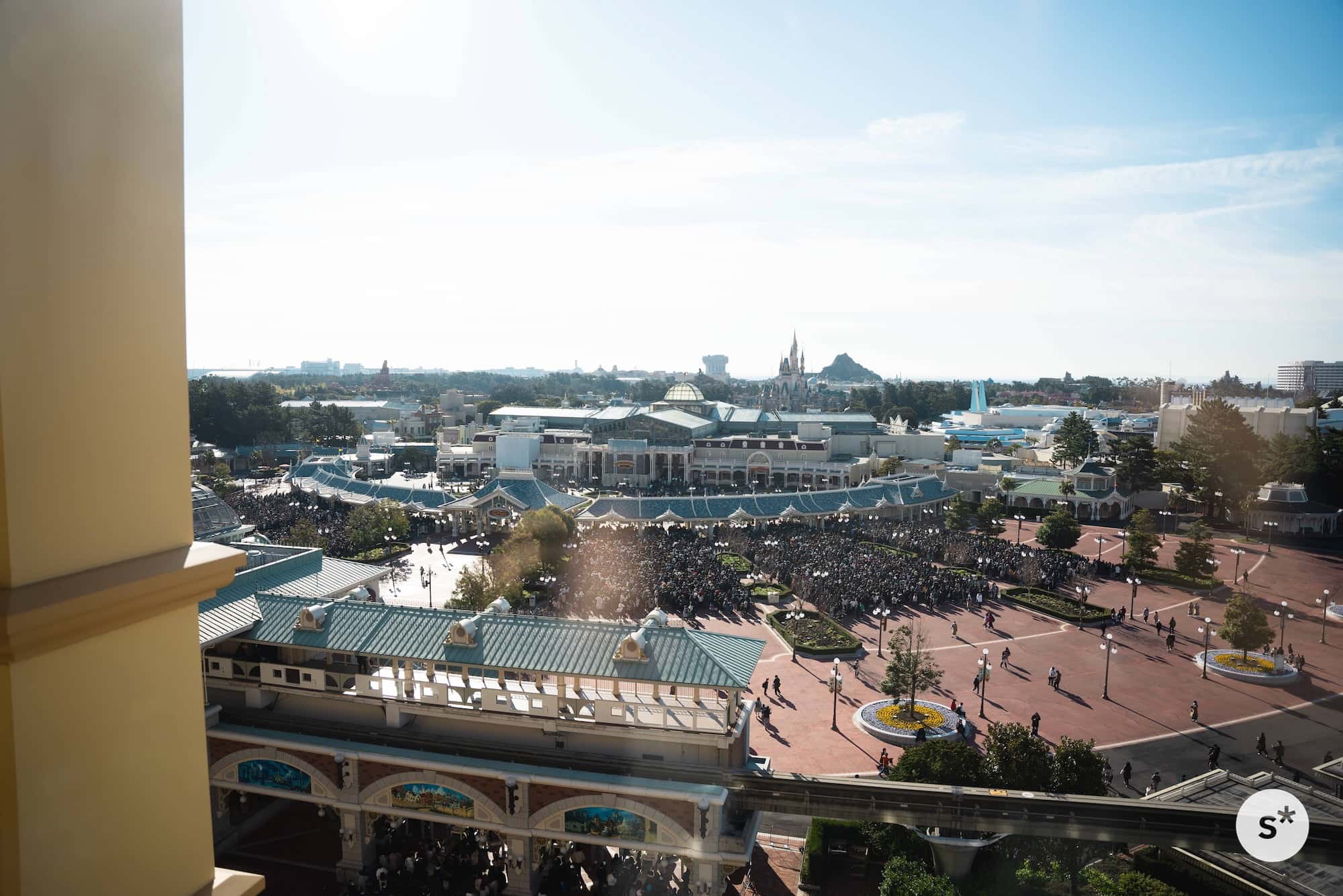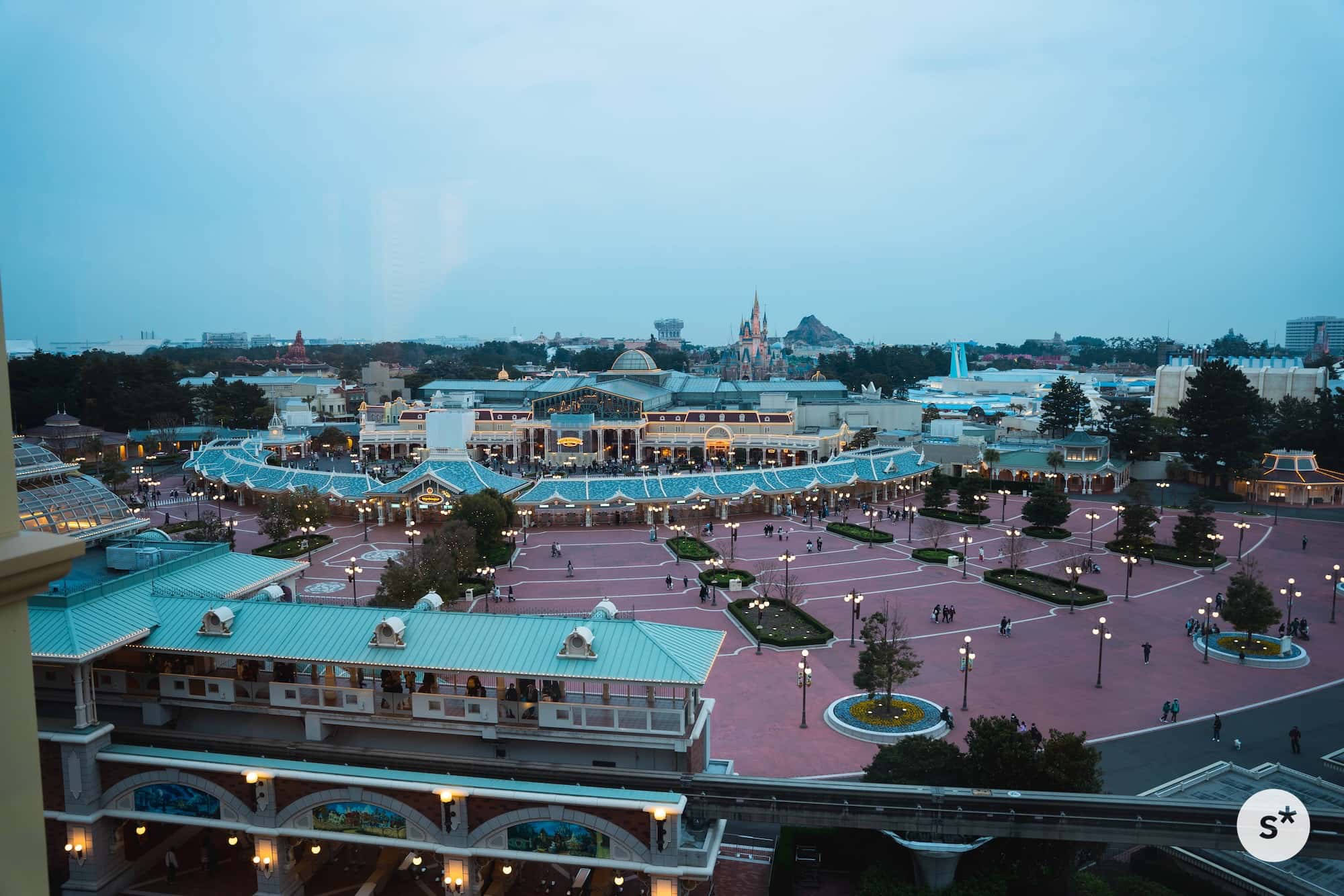 そして、これが部屋からの眺めです。「パークグランドビュー」の名のとおり、ディズニーランドが一望できます。シンデレラ城の向こうには、ディズニーシーのプロメテウス火山やタワー・オブ・テラーも見えていますね。