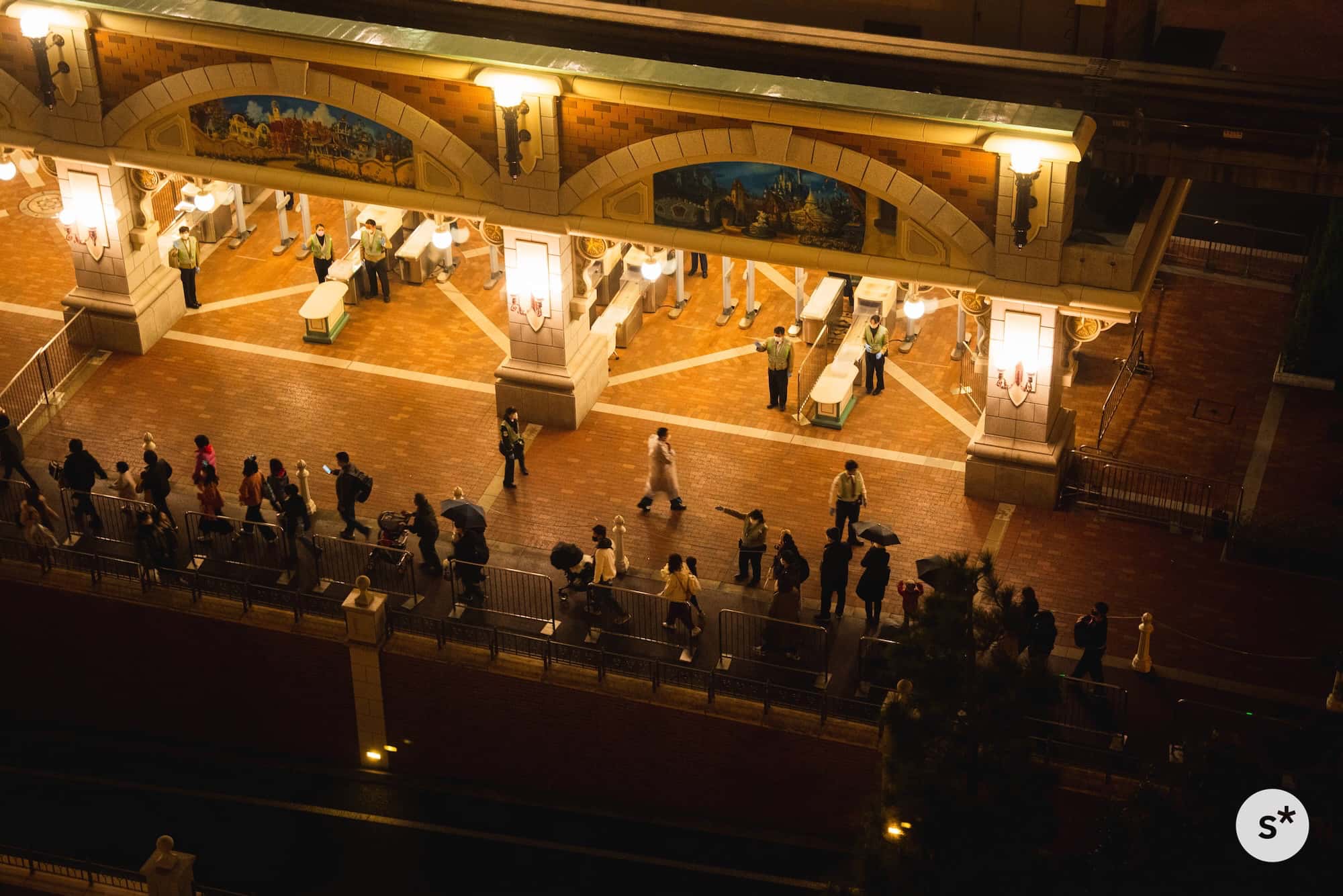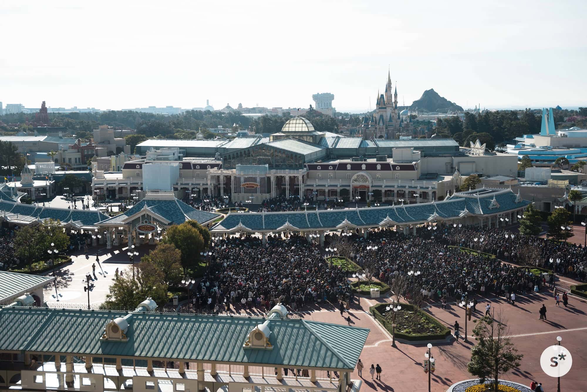 そして翌朝。ゆっくり寝て起きると、入口には入園を待つ人々の行列ができていました。という感じで、いろんな時間のパークを臨むことができ、これはこれでいい経験だったなと。