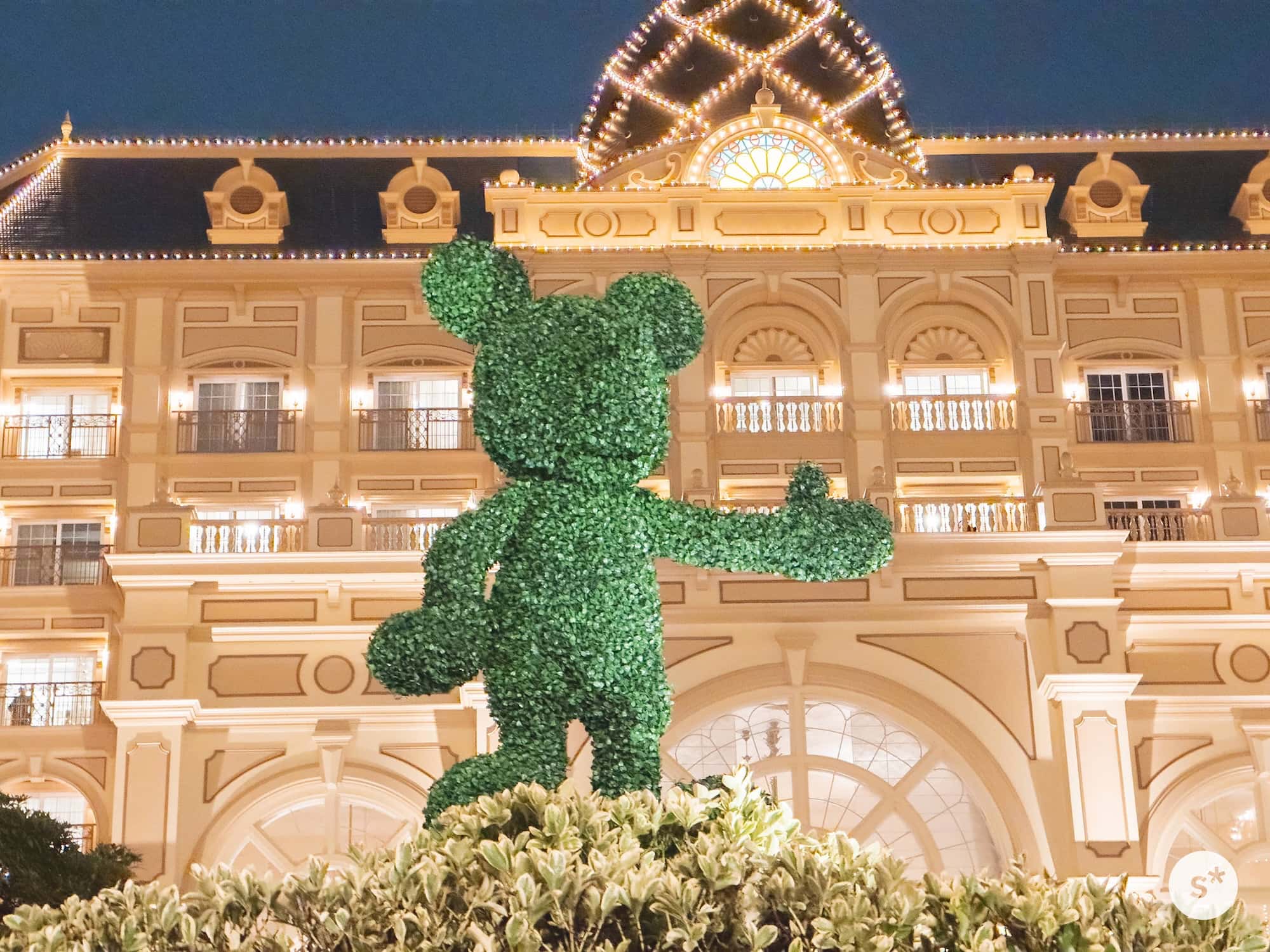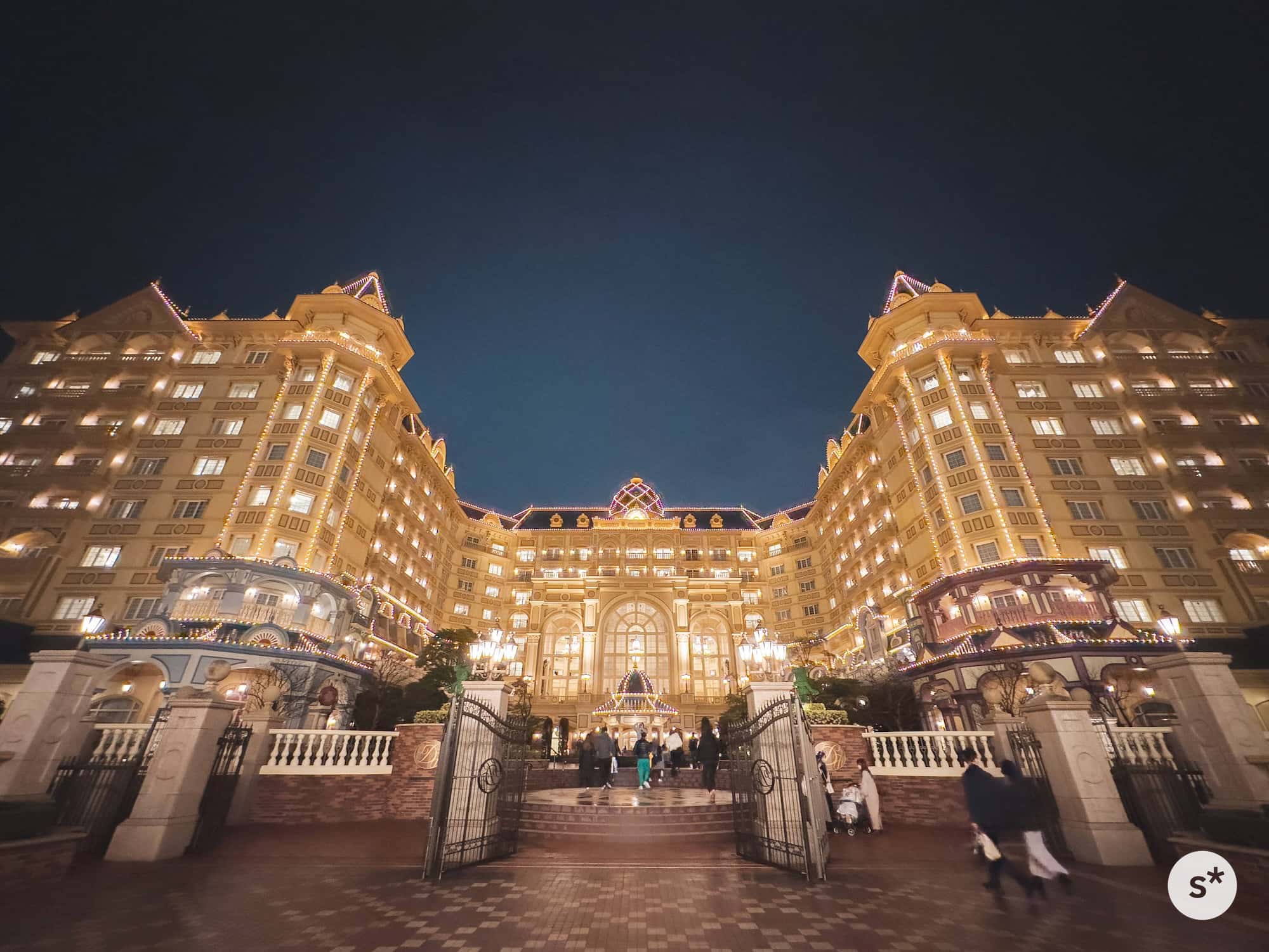 昼間の写真を撮り忘れてしまったのですが、夜の外観はこんな感じ。このホテルはパーク外にあるけれど、目を見張るデザインのおかげで、まだまだパーク内に留まっているかのような錯覚を覚えます。