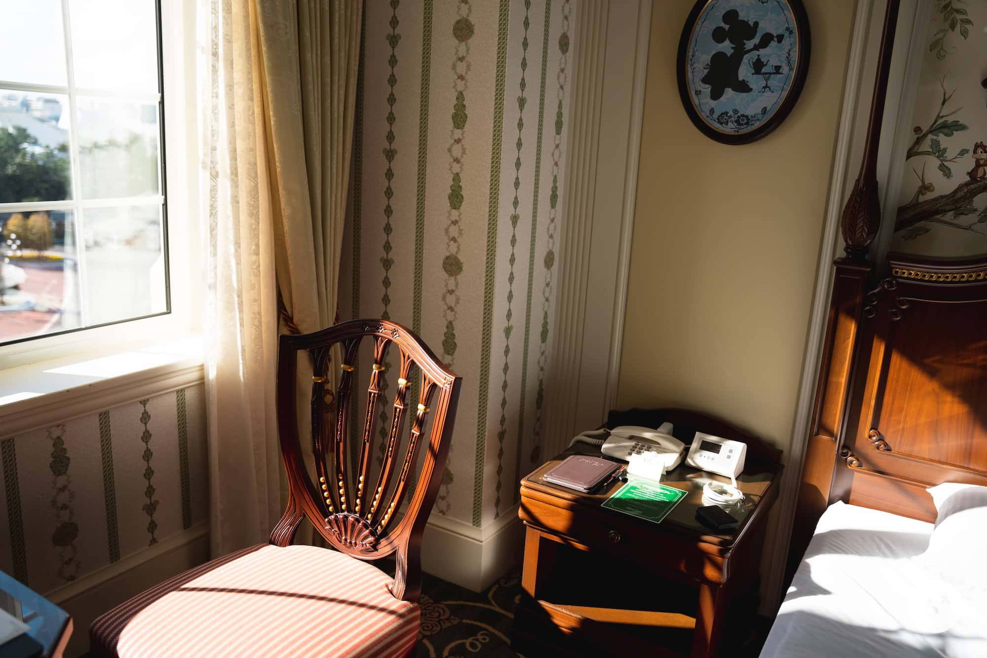 ツインが空いてなくてダブルベッドの部屋にしたので、ベッドは1つです。ディズニーランドが見える窓際にはテーブルと椅子もあり、名残惜しそうに退園する人たちや入園のために並んでいる人たちを、のんびりと優雅に眺めることができます。