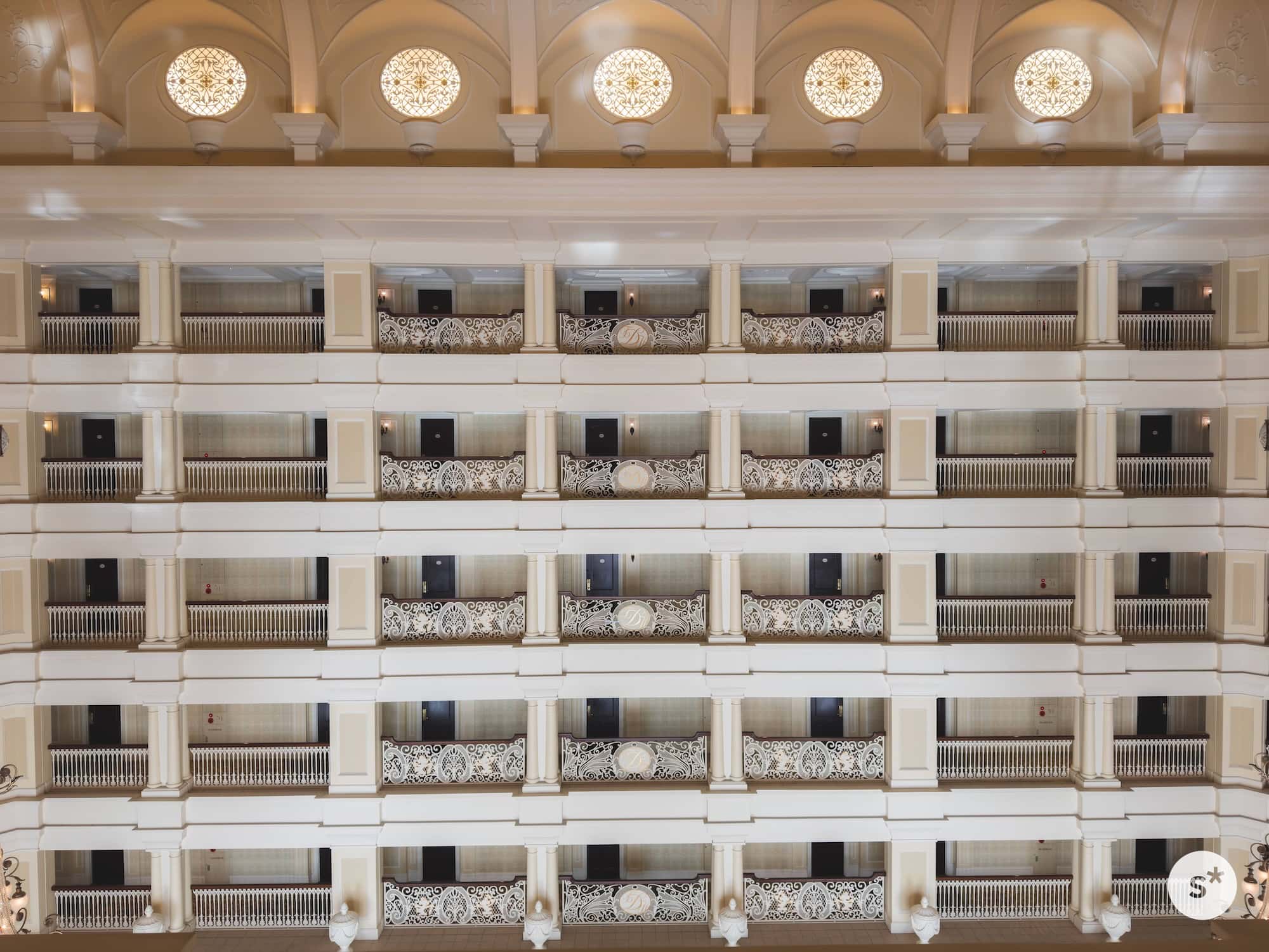 最初にロビーの写真を。写真を撮っているロビーは3階ですが、9階の天井まで吹き抜けなのすごすぎです。車でダイレクトインしたので、何の変哲もない駐車場からエレベーターに乗った先がこの景色。圧倒されたよね。
