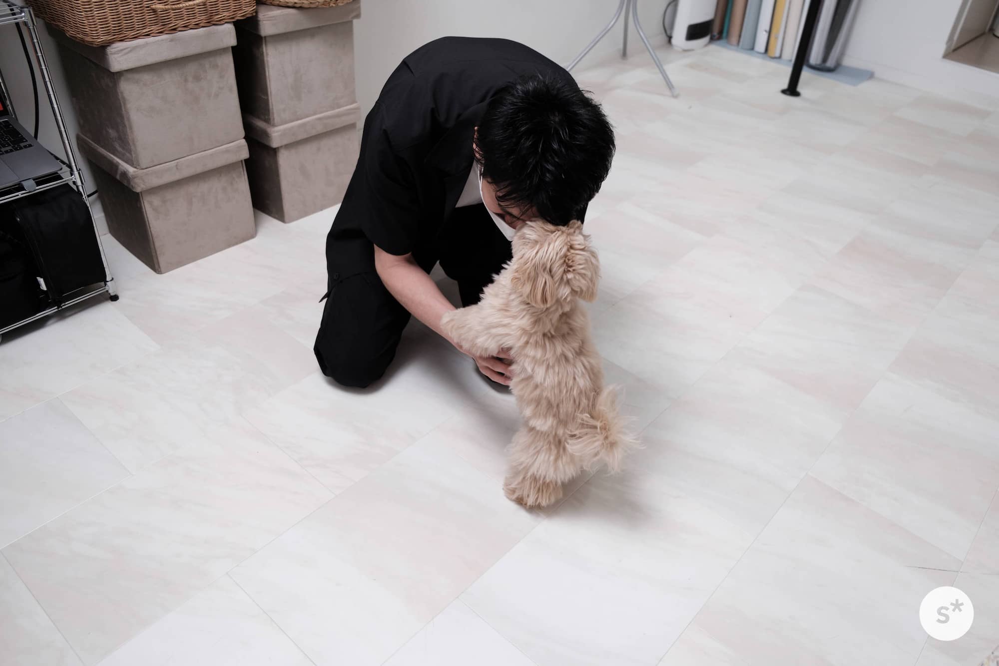 訪問すると、ご夫婦で温かく迎えていただきました。うちの犬もとても嬉しそうで、一瞬で場に慣れてくれたよね。ちなみに、慣れないスタジオで落ち着かないとか、背景紙の上が怖いとかで、全然撮影できない子もいるらしい…