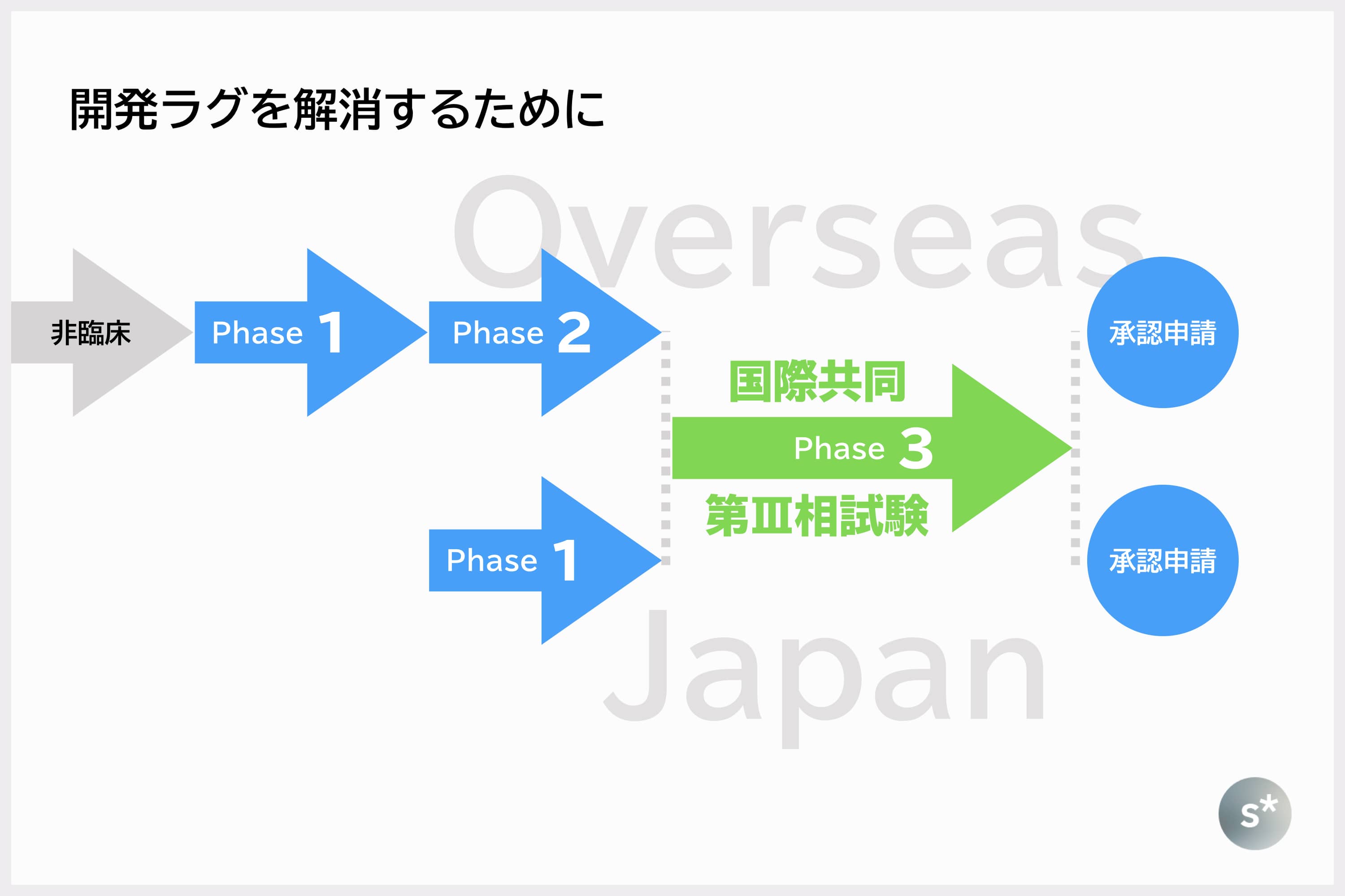 日本の第Ⅰ相試験開始を遅らせるのは変わらないけど、海外データを利用して日本の第Ⅱ相試験を省略し、日本人被験者を国際共同第Ⅲ相試験に組み入れます。そうすると、臨床試験終了のタイミングを同時にすることができ、承認申請も世界で同時に行うことができます。