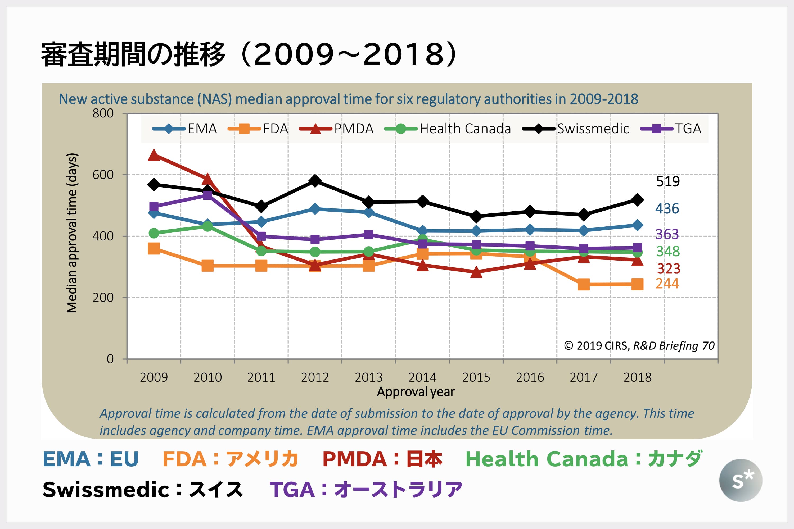 このような新薬の審査期間については、CIRS(Centre for Innovation in Regulatory Science)という機関が毎年調査を行っていて、2019年版のデータ(2009〜2018年の10年間)がこちらです。