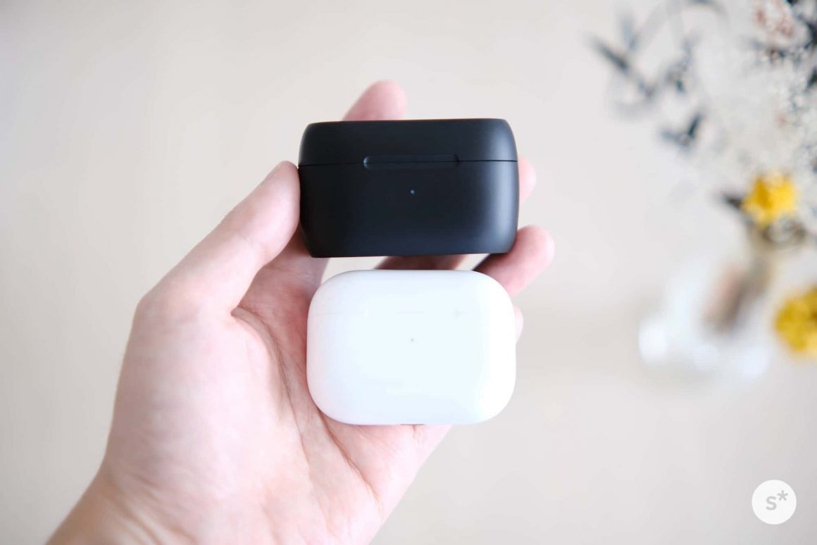 充電ケースのサイズは「高さ3.9×幅6.6×厚さ2.9cm」。AirPods Proと並べても同じくらいで、手の収まりもいいです。