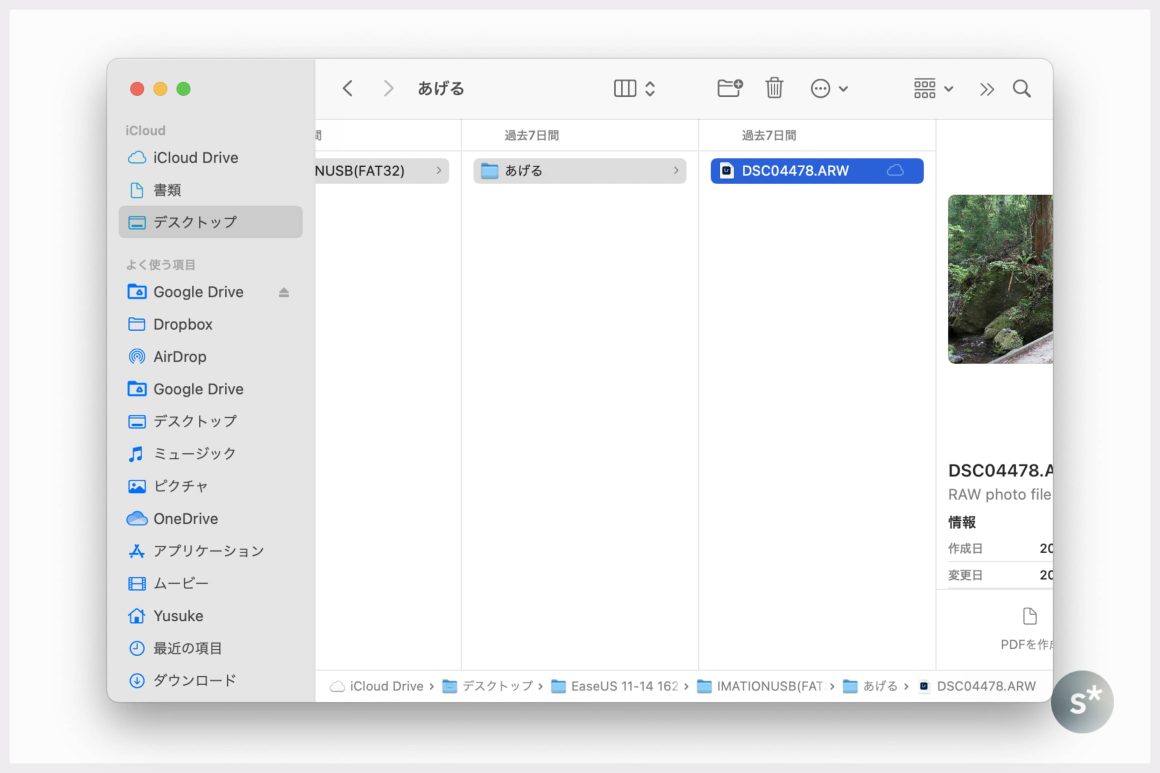 今回は「あげる」というフォルダの「DSC04478.ARW」という写真を復元してみます。半年くらい前に削除したファイルです。