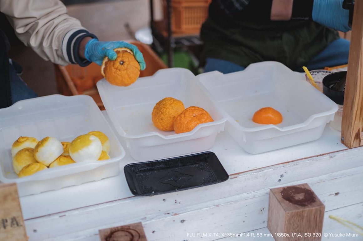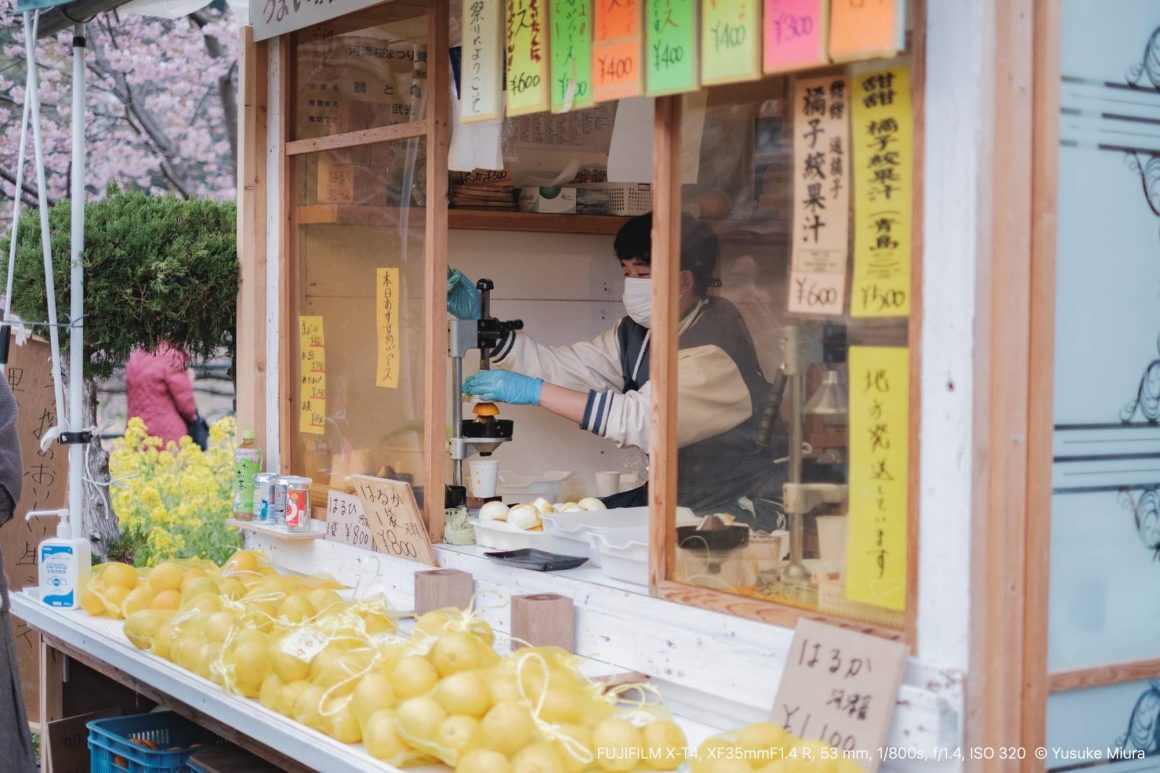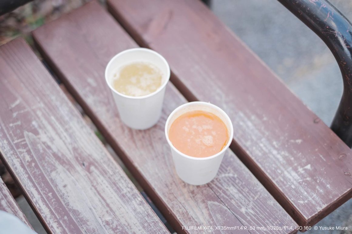 この河津桜を見に来たら、必ず生搾りジュースを飲むことにしています。