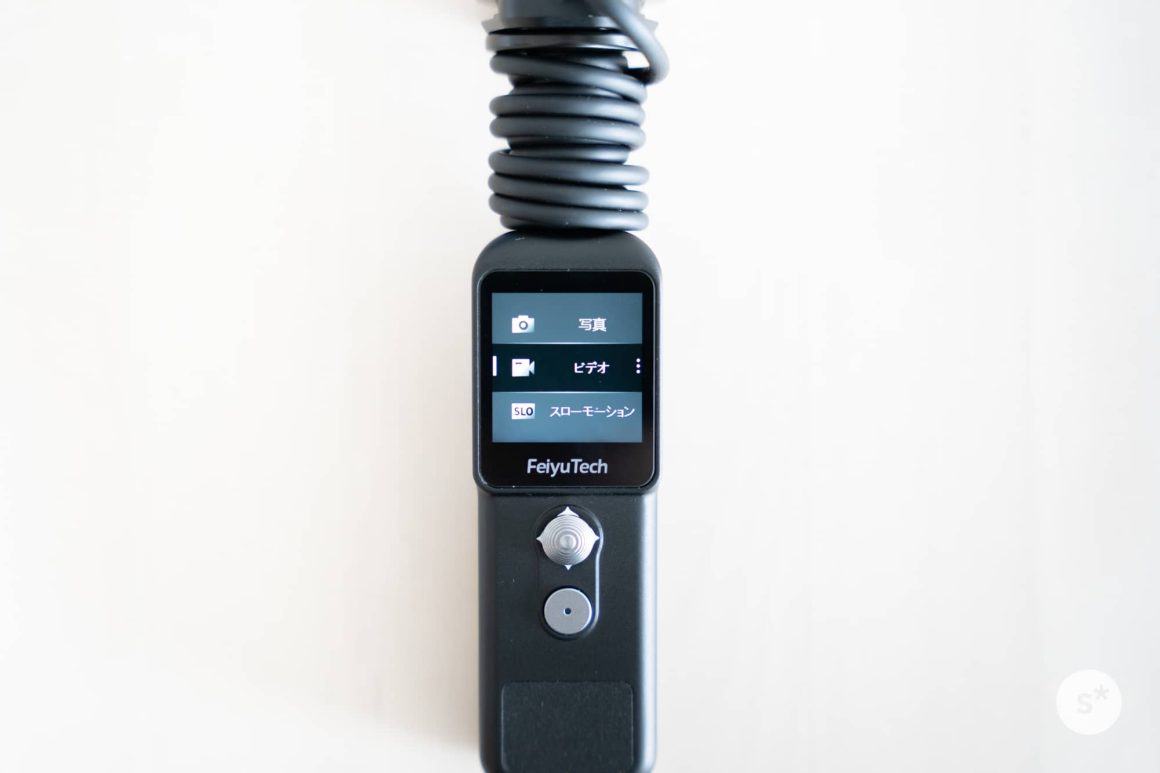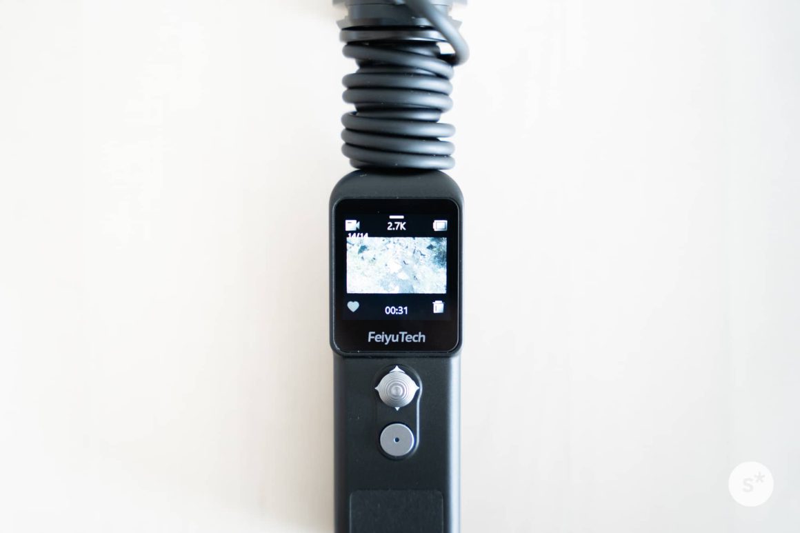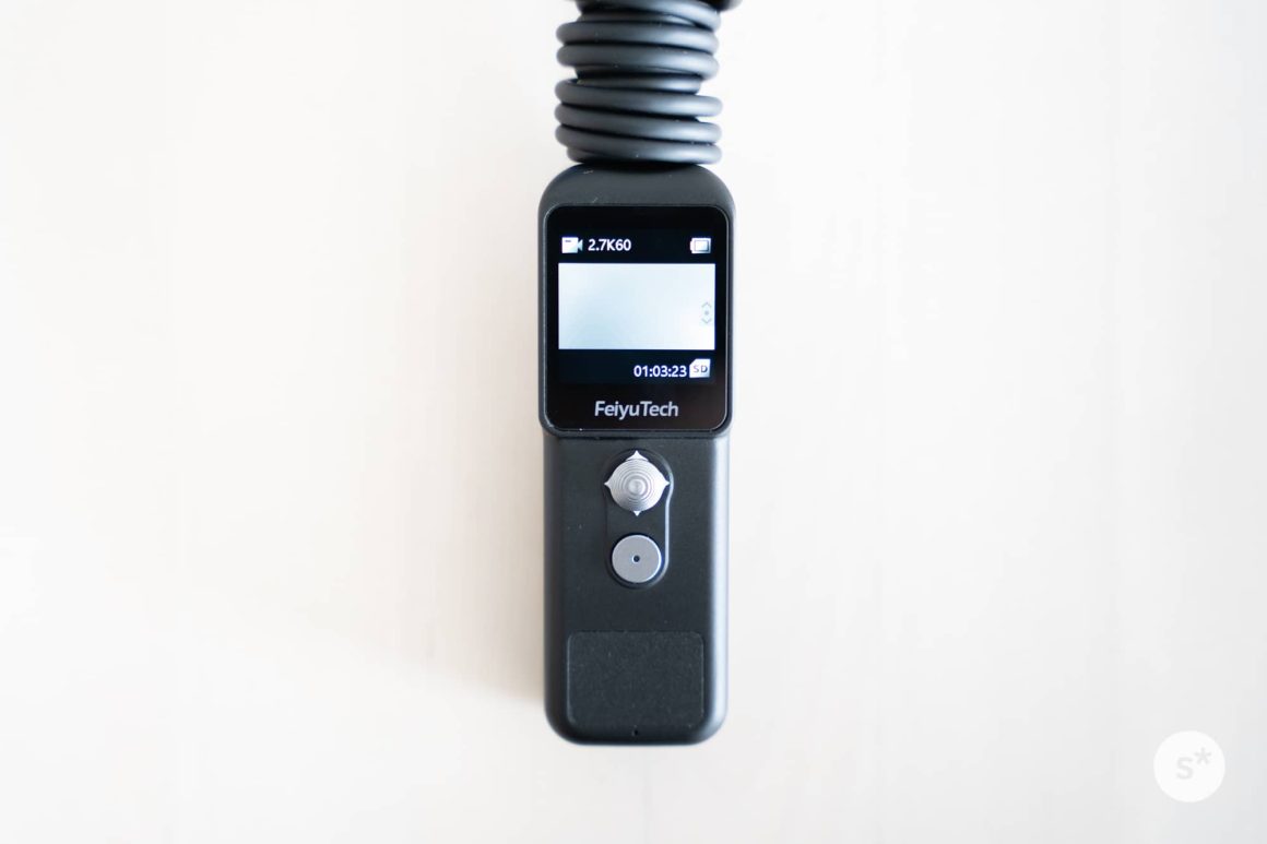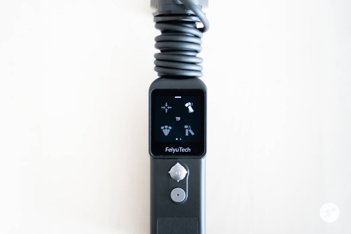 正面には1.3インチの正方形のディスプレイがあり、その下にはFeiyuTechのロゴ。さらに、ジンバルカメラを動かすためのジョイスティックと、録画ボタンがあります。