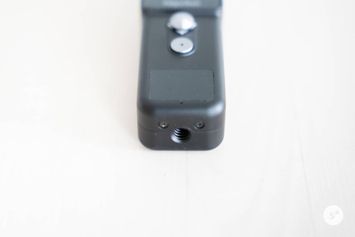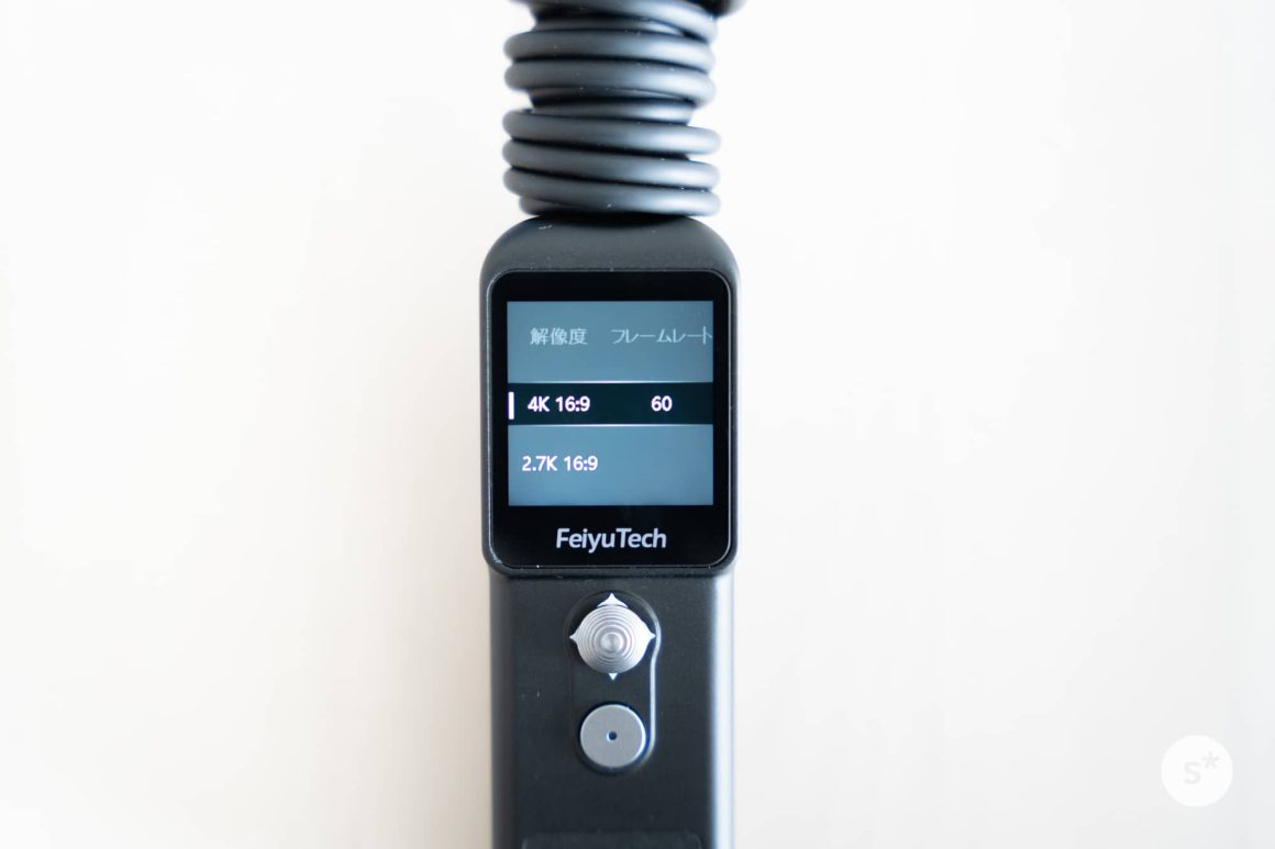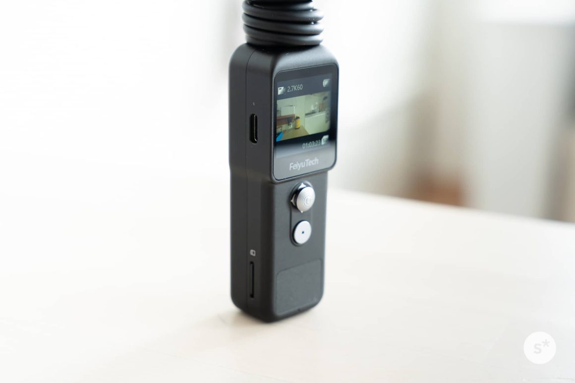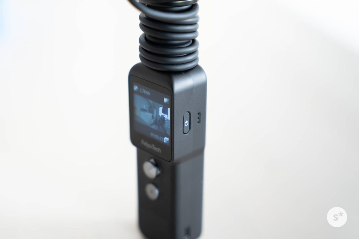 正面には1.3インチの正方形のディスプレイがあり、その下にはFeiyuTechのロゴ。さらに、ジンバルカメラを動かすためのジョイスティックと、録画ボタンがあります。