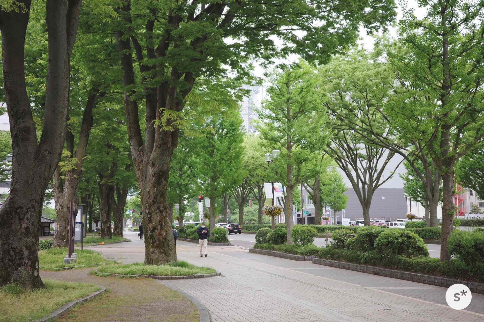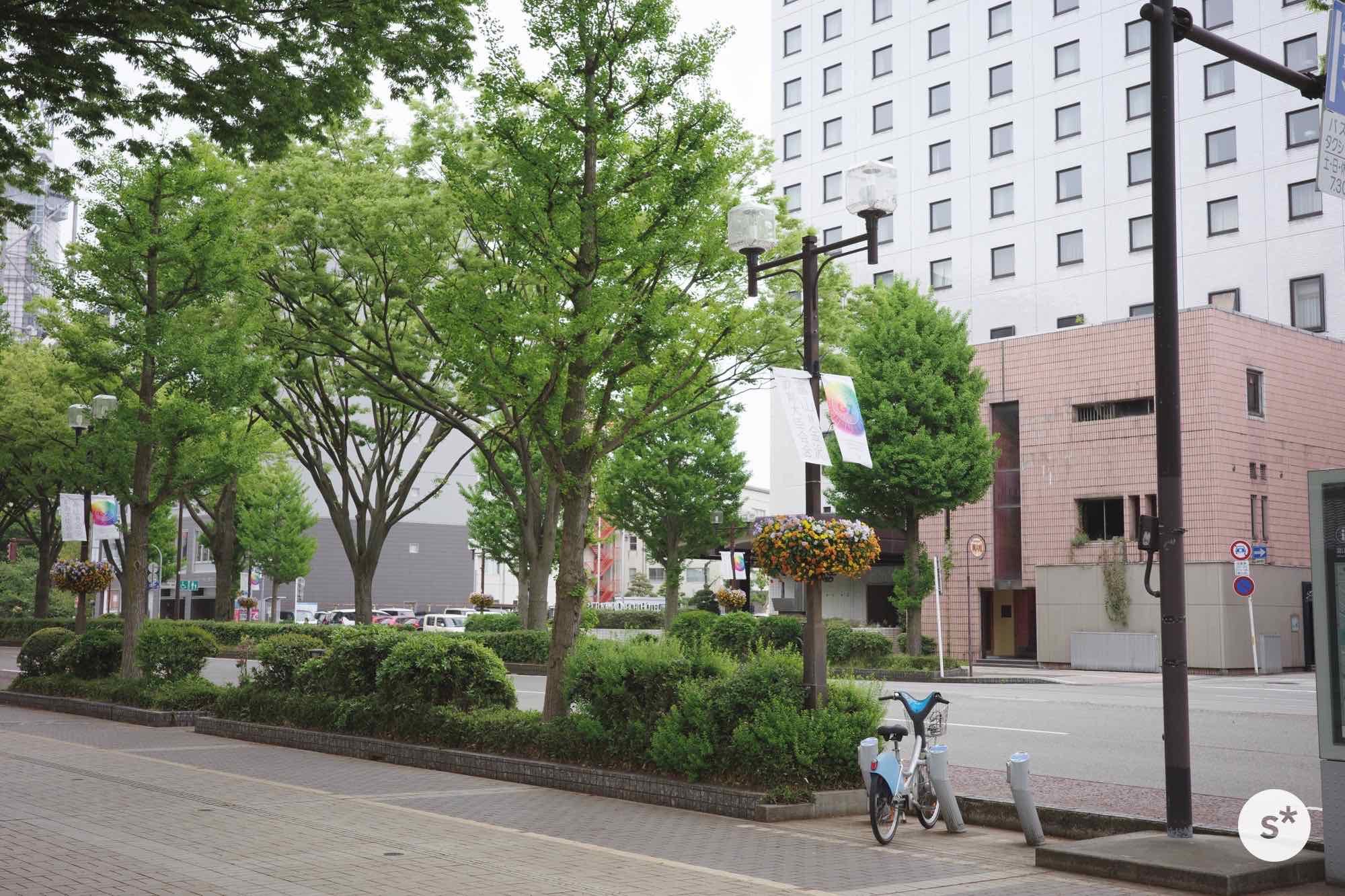 富山城址公園から出ると、大きな通りに出ました。たくさんの緑に覆われていて、めちゃめちゃ気持ちいいな。この日の最高気温は17℃くらいで涼しく、スーツを着ている身としては歩いても暑くならなくて過ごしやすかった。