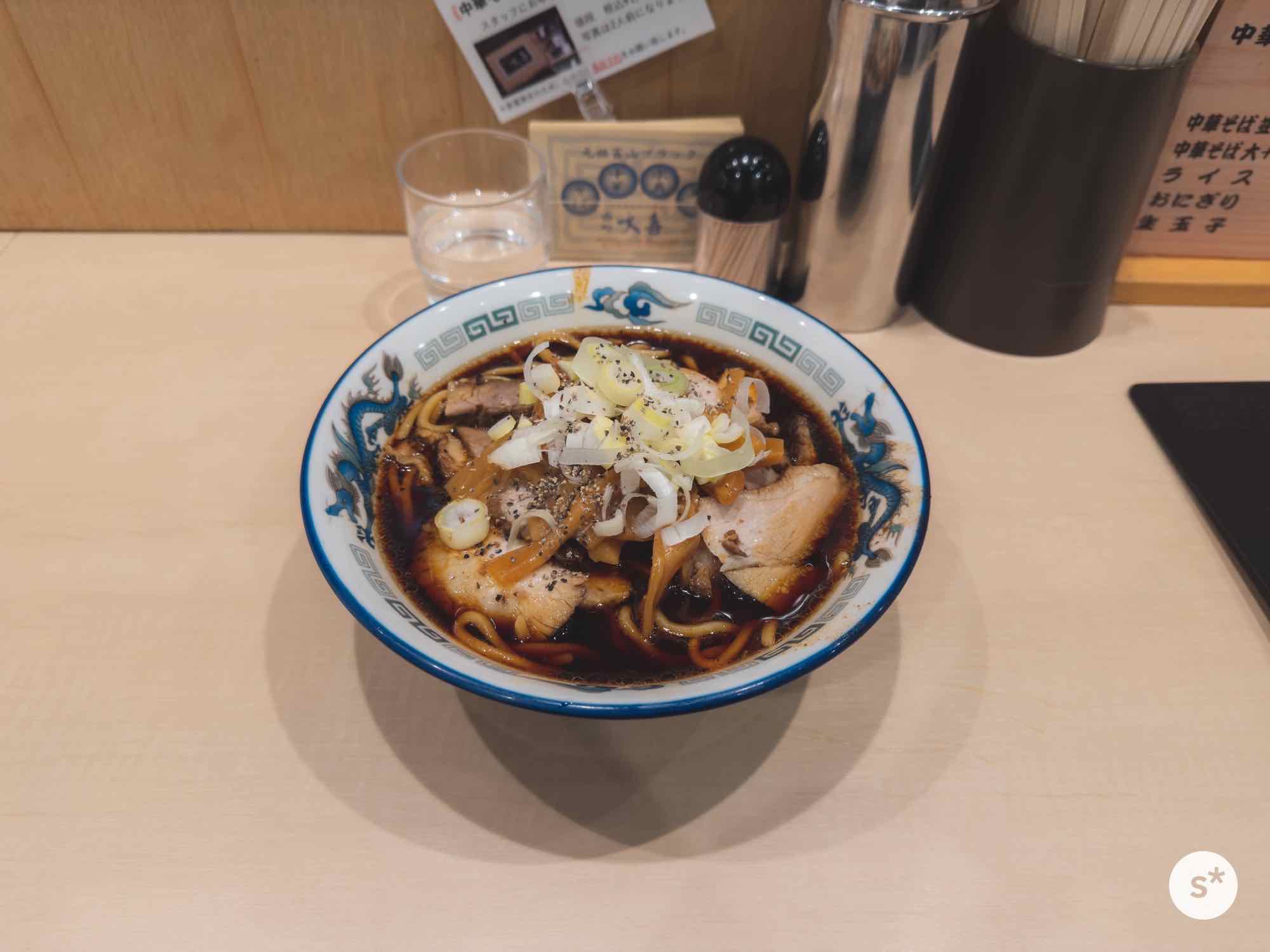 お腹が空いていたので「中華そば 大」を注文。運ばれてきたラーメンを見ると本当に黒い…!(黒さの正体は濃い醤油とブラックペッパーでした)