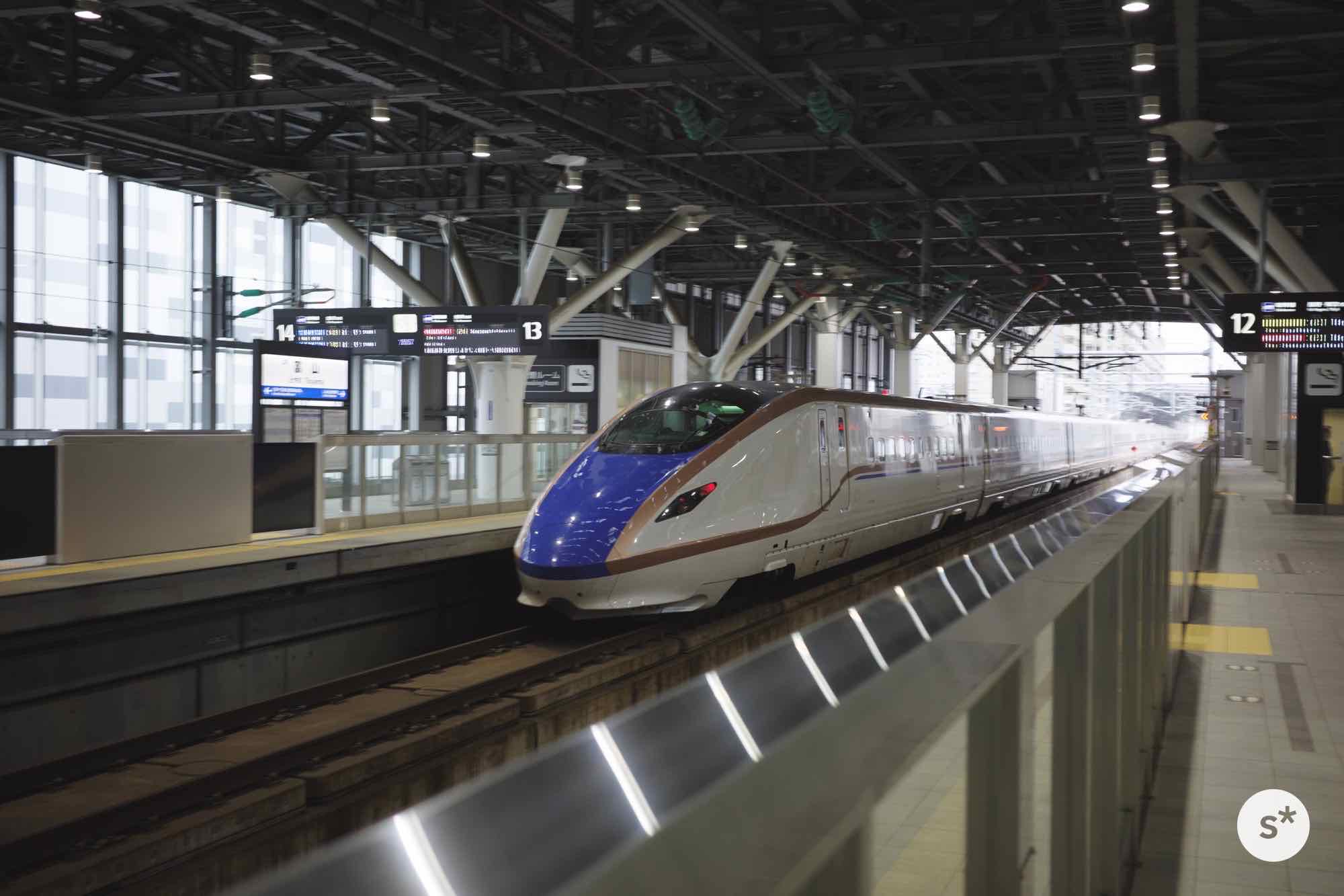 10時半くらいに東京駅を出る「かがやき」に乗って富山を目指しました。停車駅は、東京 → 大宮 → 長野 → 富山という長距離移動に全振りした列車で、東京-富山間の約400kmを2時間10分ほどで結びます。