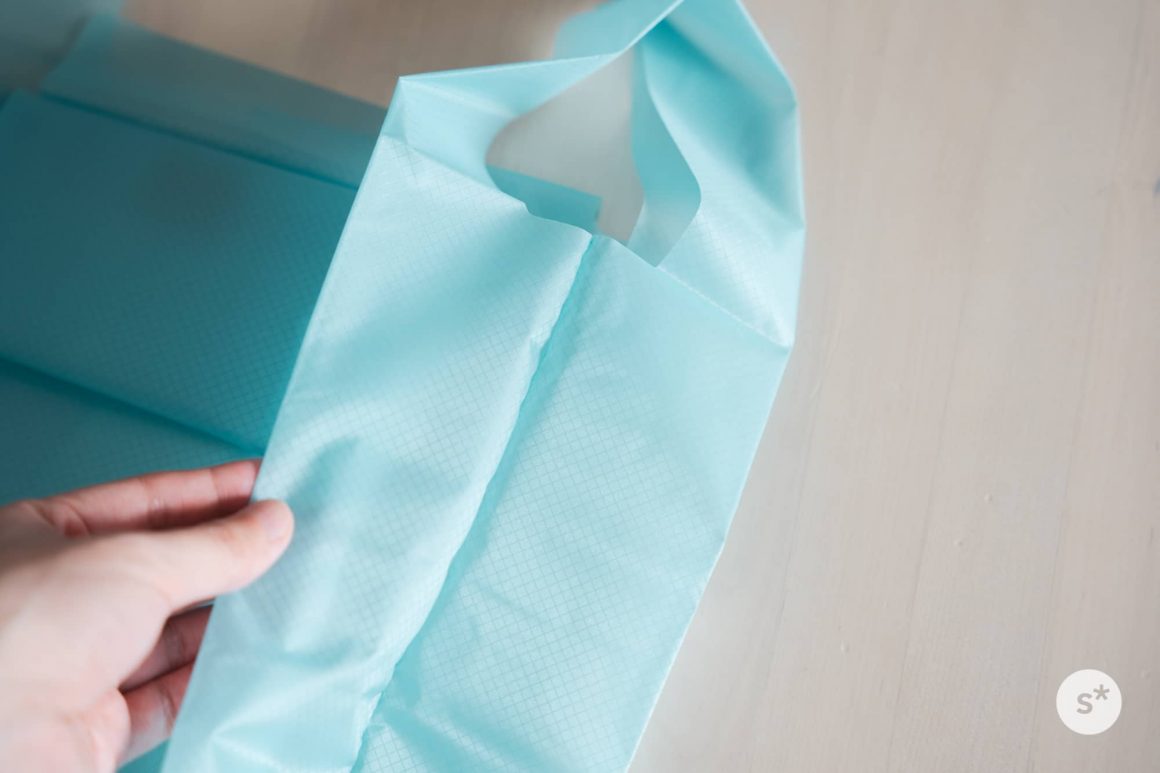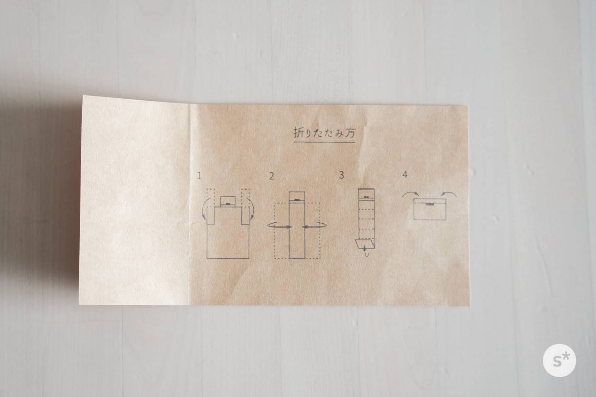 薄いという特徴を活かし、使わないときは小さく折りたたむことができます。親切な説明書の裏にはたたみ方が書いてあり、記載のとおりにたたんで収納部分の袋に入れるだけ。この袋は本体から外れないようになっているので、無くす心配もありません。