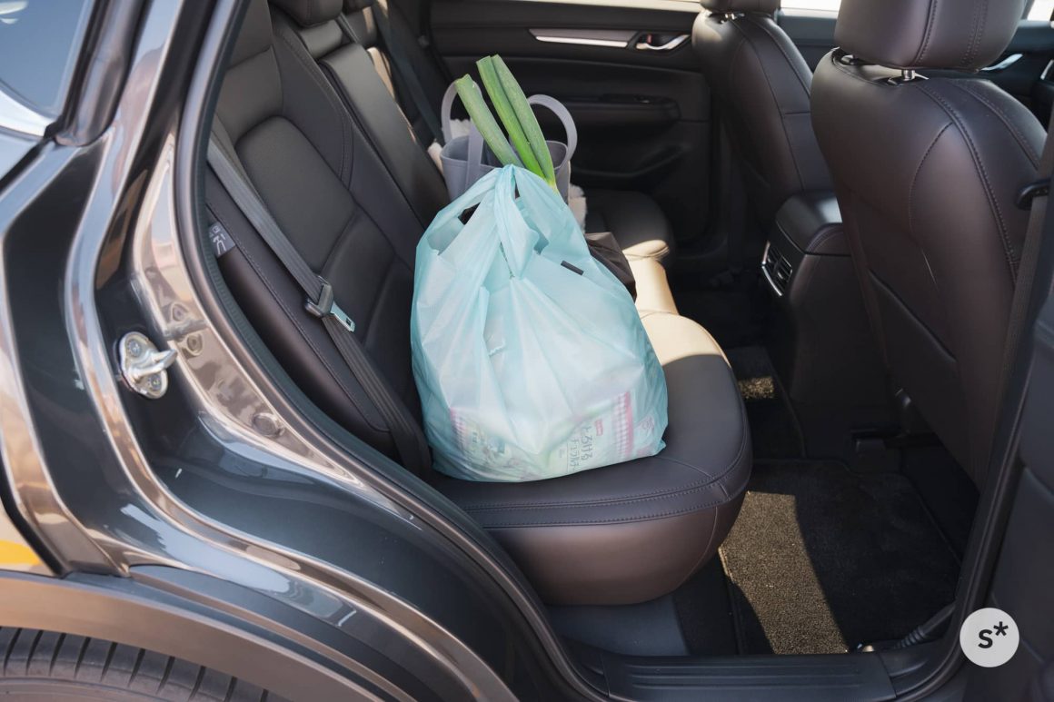 買い物を終え、駐車場に戻ってきました。持ってみると下のような感じです。Lサイズはスーパーでよくある「大サイズ」の袋と同じくらいの大きさで、我が家の1週間分の食料はLサイズ2枚でちょうどよかったです。