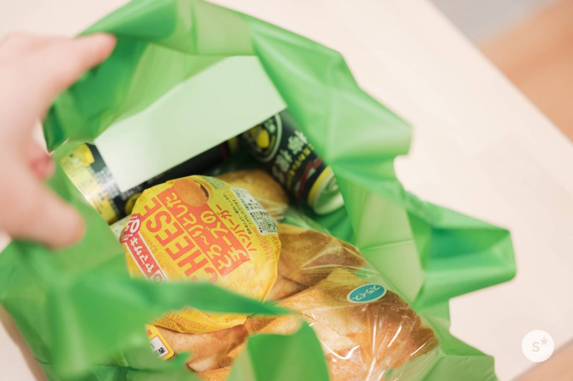 さらに、別の機会にMサイズも使ってみました。こちらには、バケット、チーズバーガー、350mL缶チューハイ2本を入れました。ちょっとした買い物に使いやすいサイズです。コンビニに行くときはMサイズがちょうどいいかも。