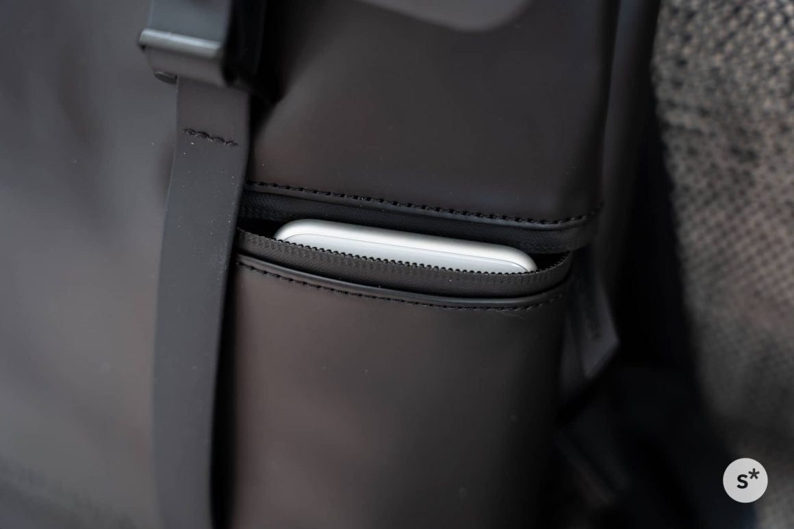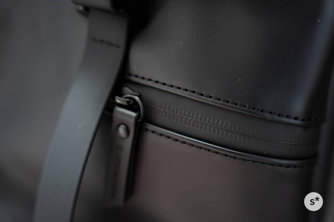 そうなんです、ヴィーガンレザーの特徴として「耐水性能」があります。リアルレザーは水に弱いのに対して、ヴィーガンレザーは雨の日でも大丈夫。その特徴を補完するように、前面ポケットのファスナーも防水仕様になっています。これはいいね。