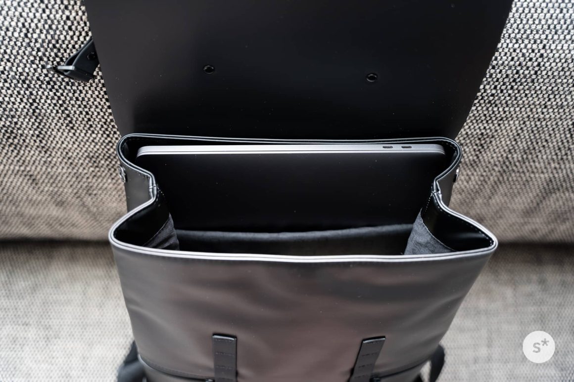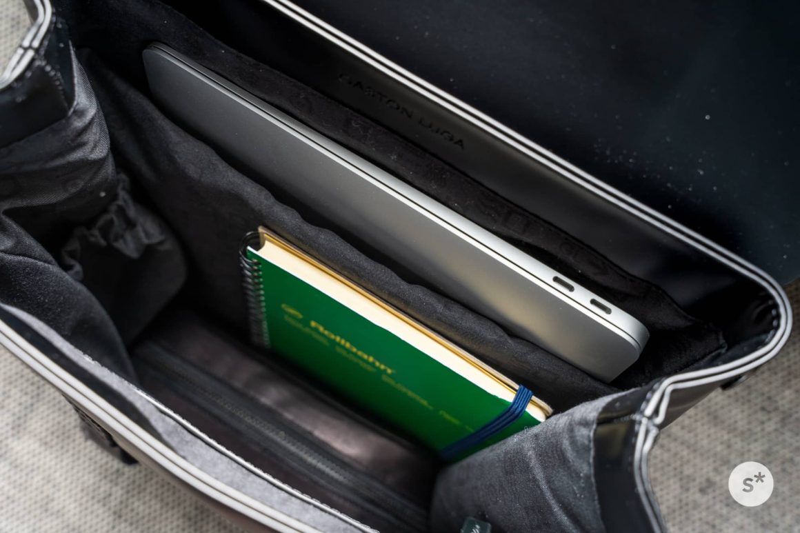 13インチMacBook Airを入れてみました。左右にもゆとりがあり、使いやすいです。パソコンのまわりはクッション性のある素材になっています。ただ、メインコンパートメントとの仕切りは上までカバーされるわけではなく、MacBook Airが少しはみ出ていますね。