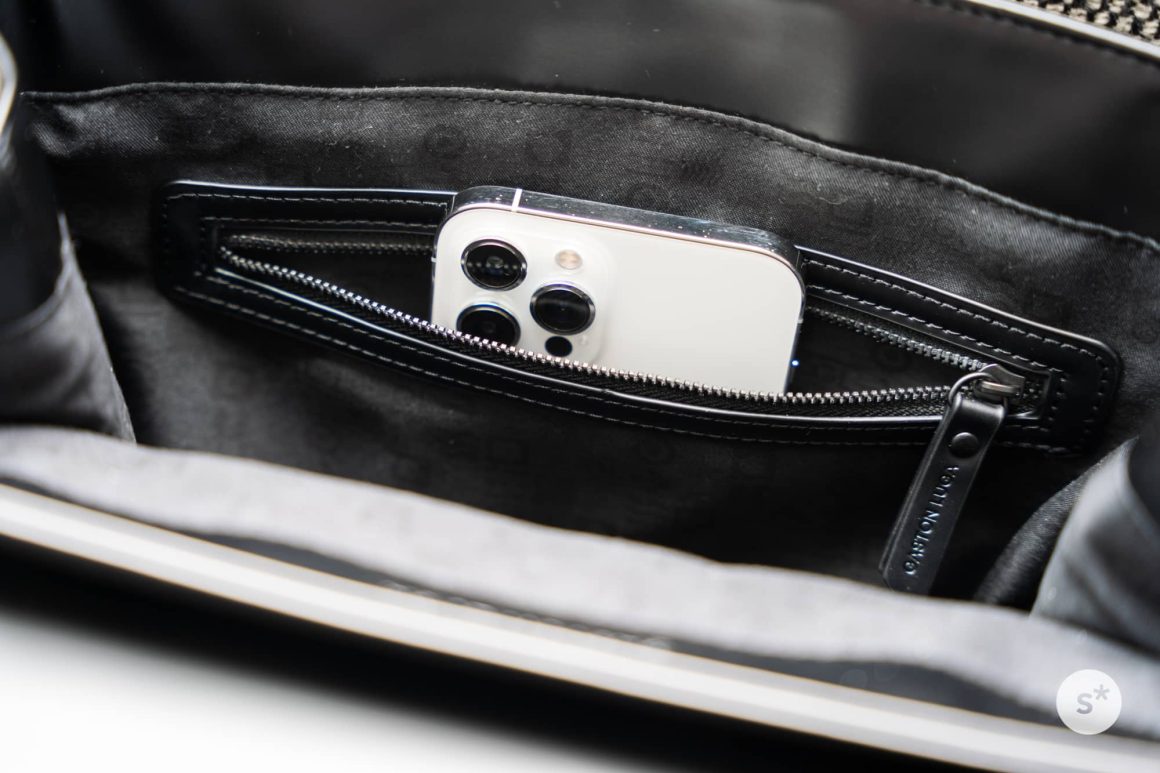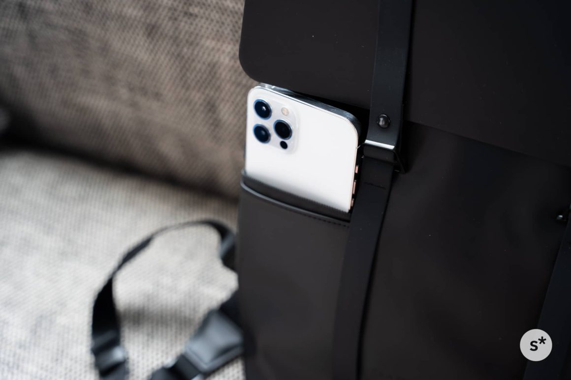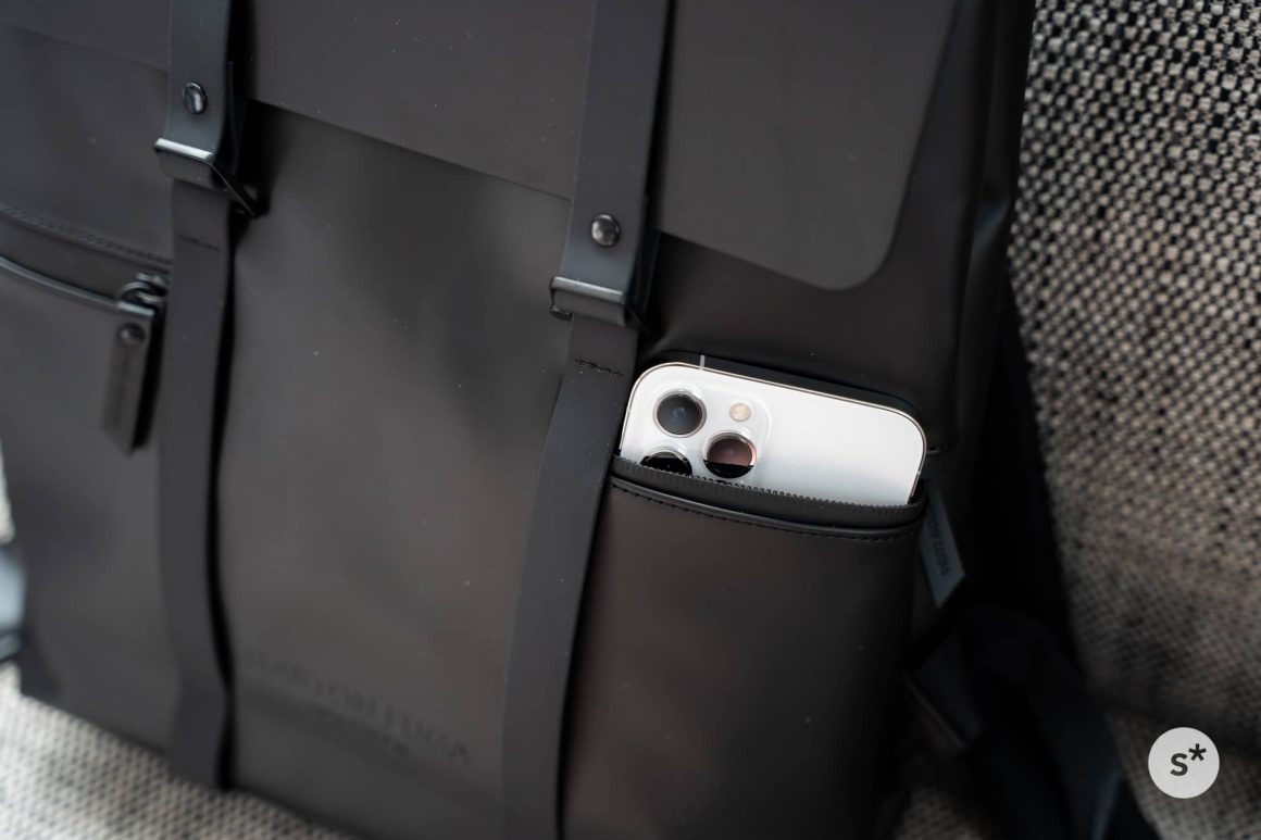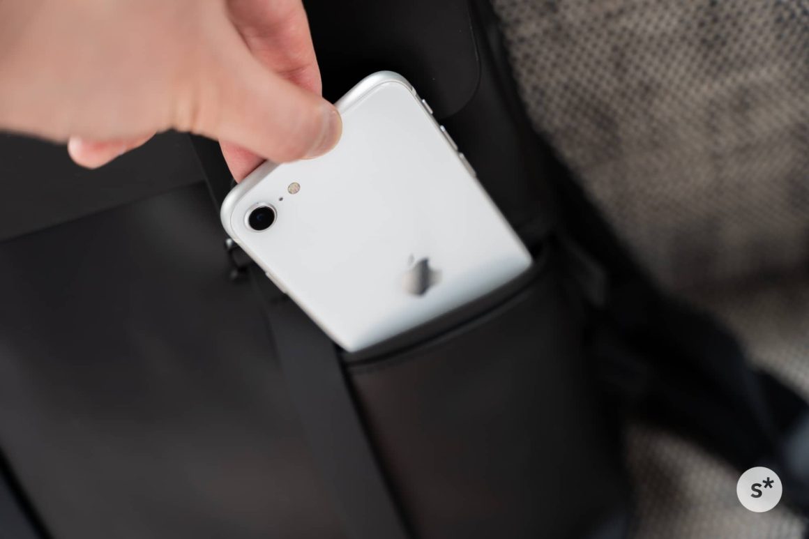 ちなみにこの2つのポケット、幅は同じですが高さが異なります。iPhone 12 Pro Maxを入れてみましたが、向かって左側は半分程度しか入らなかったのに対し、右側には8割くらい入りました。iPhone SEならちょうどいい高さです。