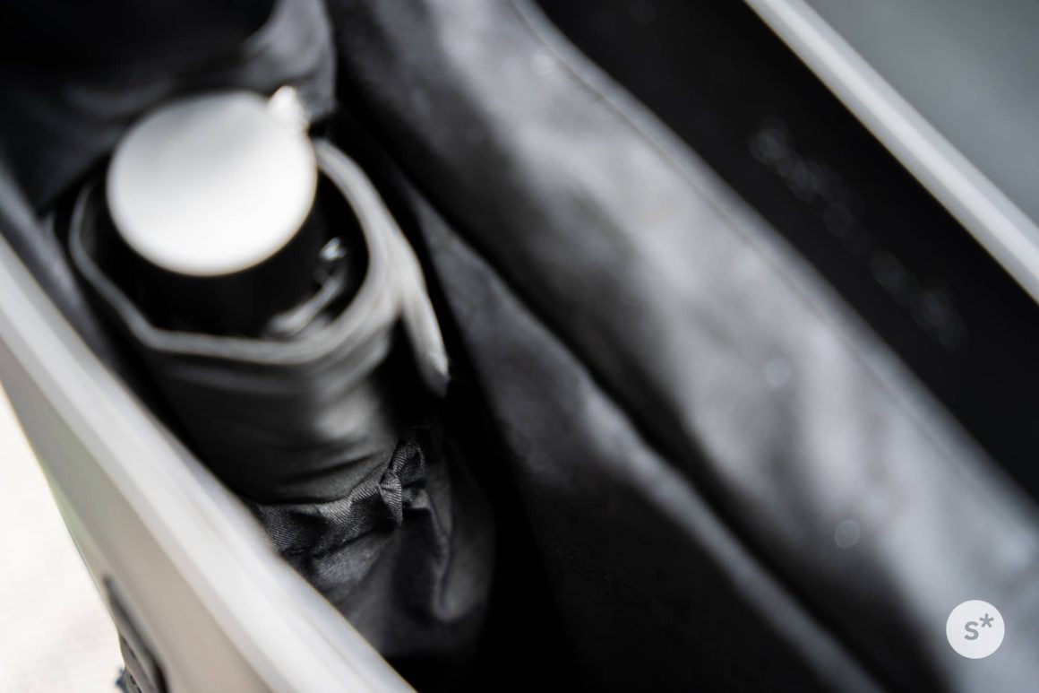 メインコンパートメント内には折りたたみ傘やペットボトルを入れるためのホルダーもあります。上がゴムで絞られていて、簡単に抜けないようになっています。