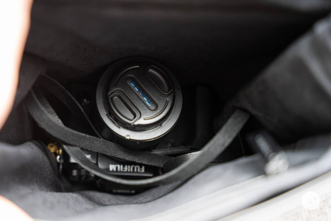 メインコンパートメントはカメラも入るサイズです。FUJIFILM X-T4を入れたら若干きついので、ちょっと出し入れしにくいと思われます。もっと小さいカメラなら大丈夫です。