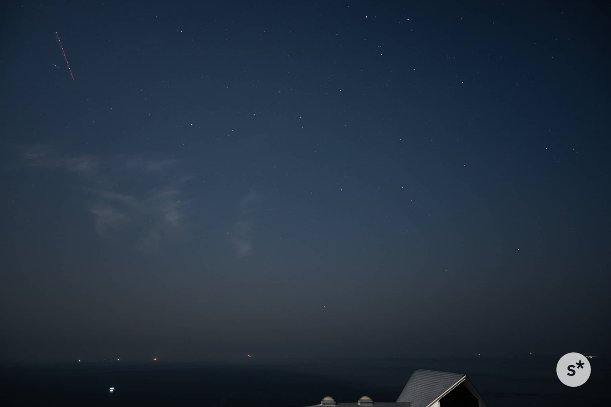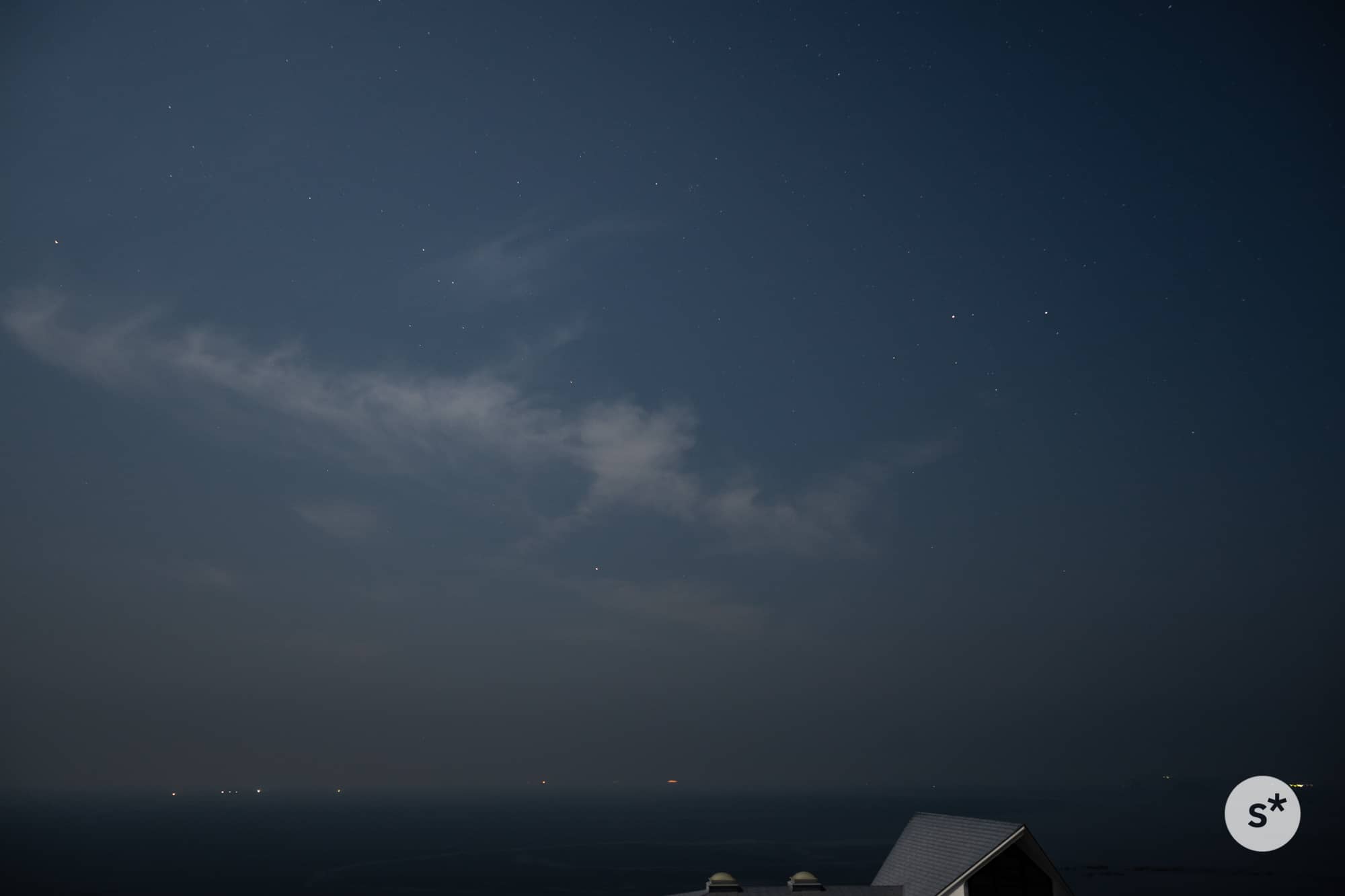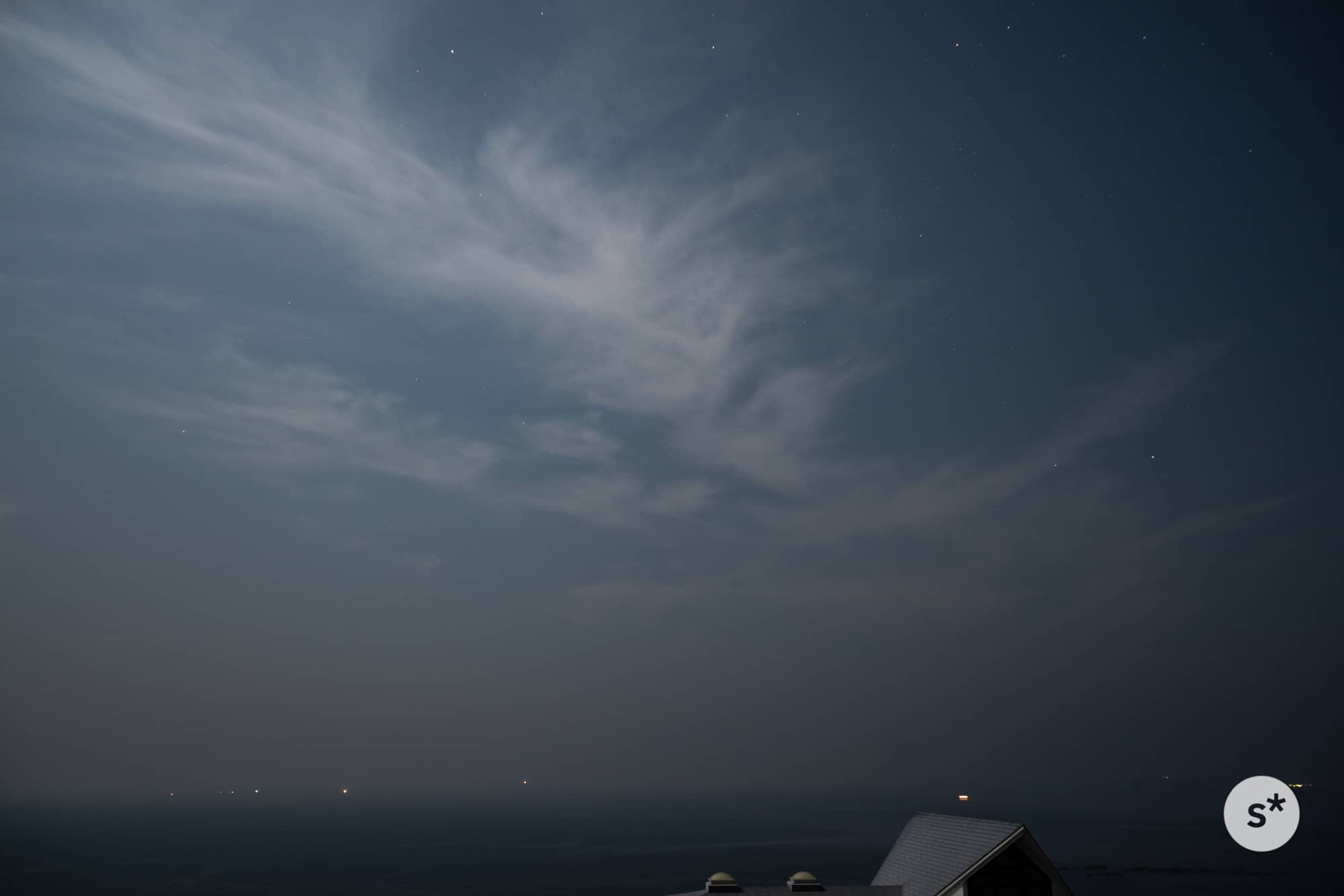 月に背を向けて撮影しなければならなかったので、西の空を撮っています。下の方は海(東シナ海)で、ポツポツ見える明かりは船ですね。