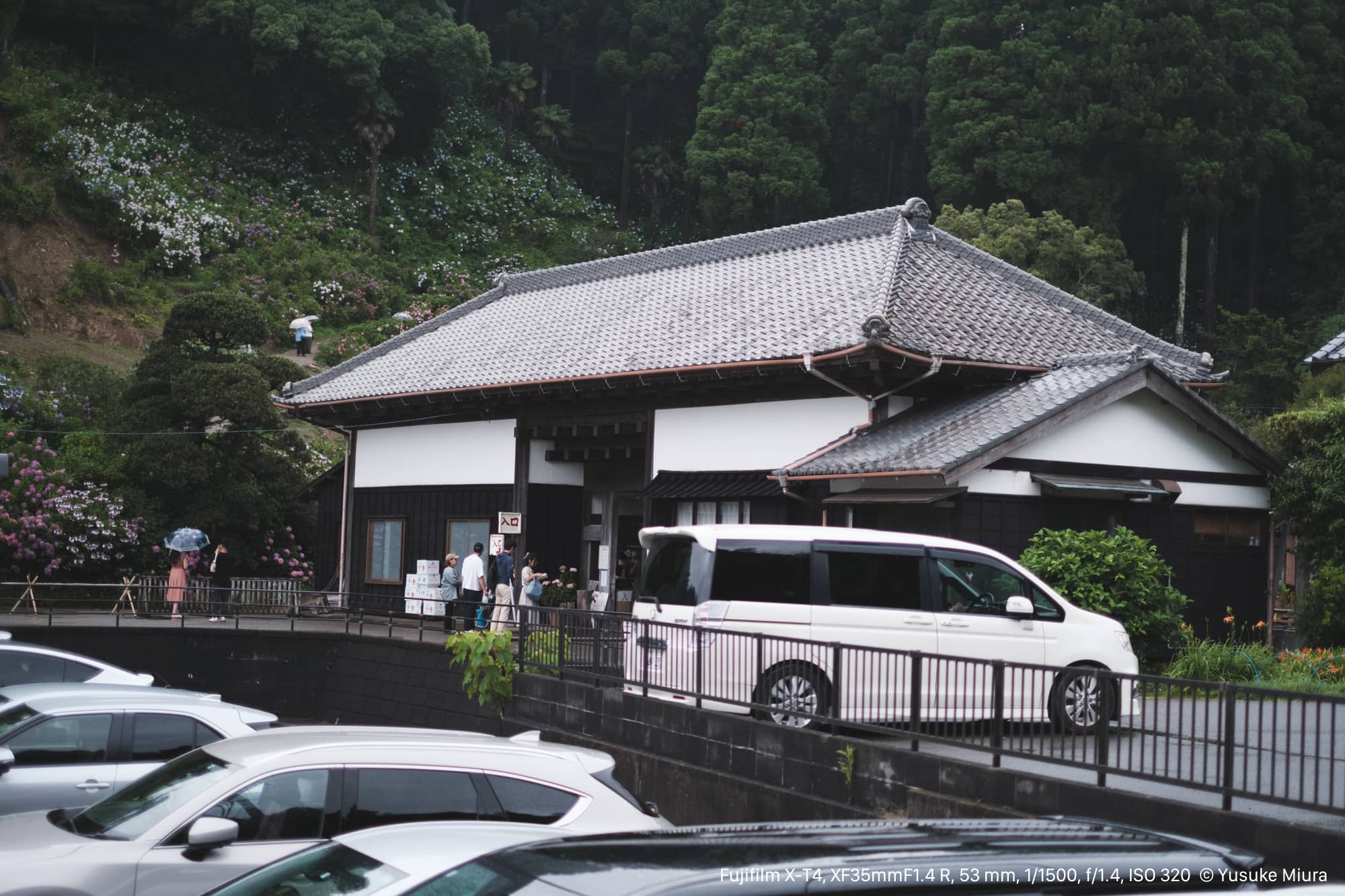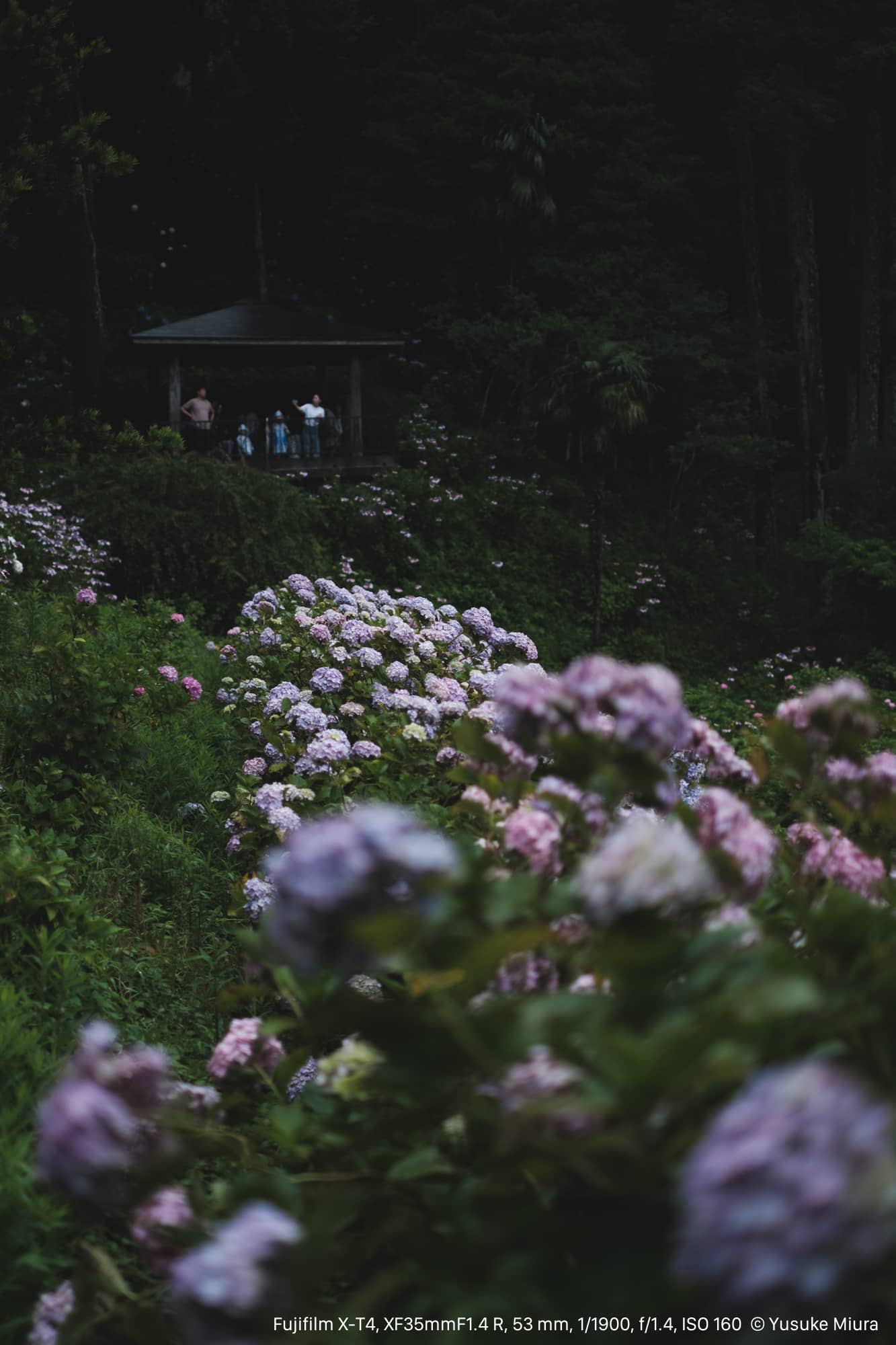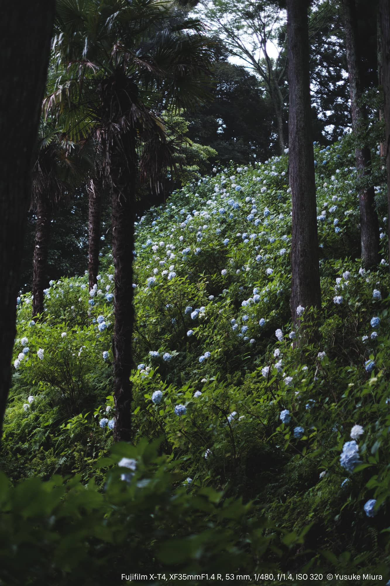 このあじさい屋敷の一部は林の中にかかっていて、大きな木が落とす影のおかげで全体がよりしっとりとした雰囲気に。それをXF35mmF1.4 Rで切り取ると。味があってとてもよいです。