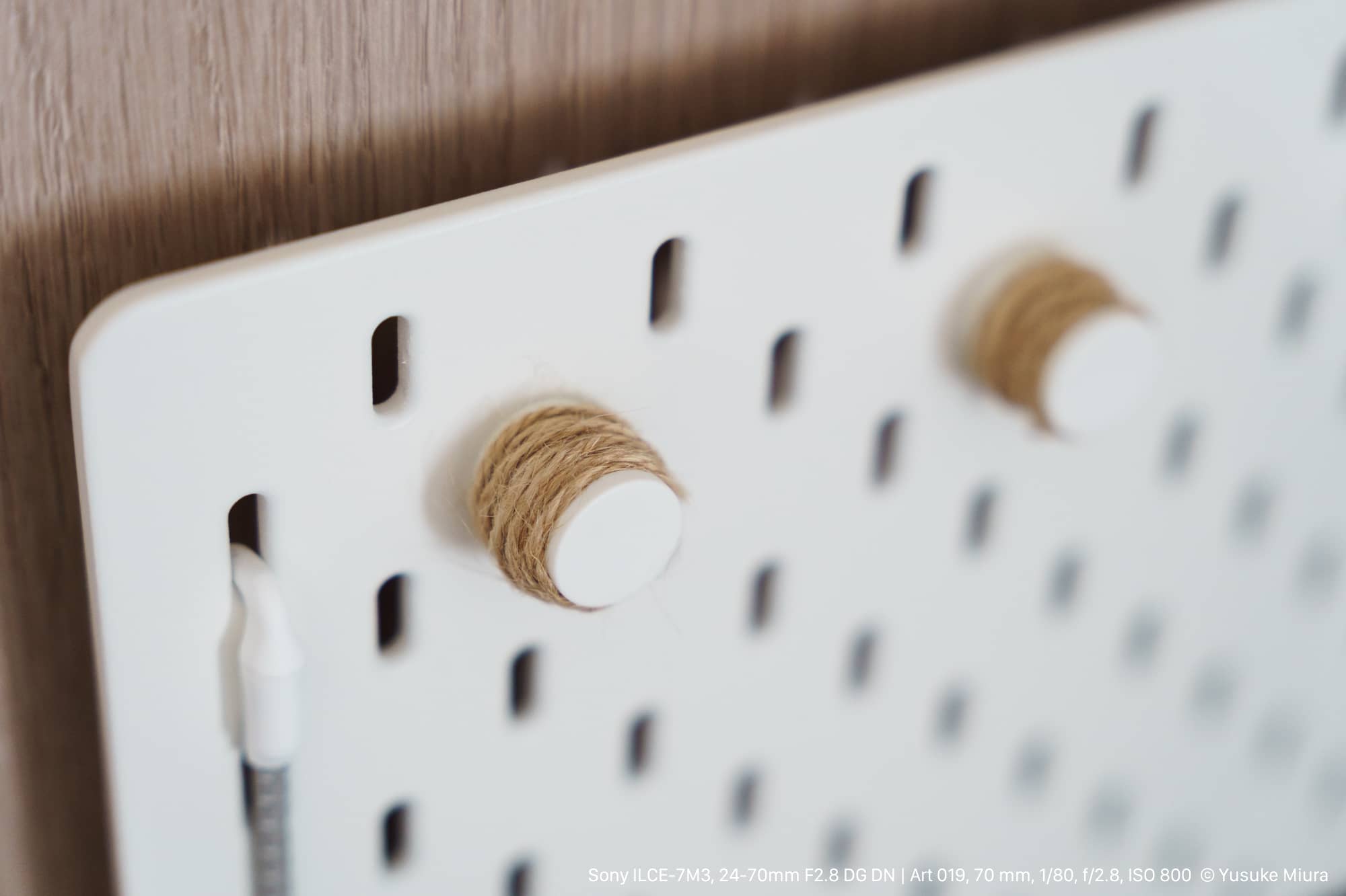 使っている有孔ボードは、IKEA「SKÅDIS スコーディス」56×56cmのものです。昇降デスクと一緒に上下するように、壁ではなくデスクにマウントしています。