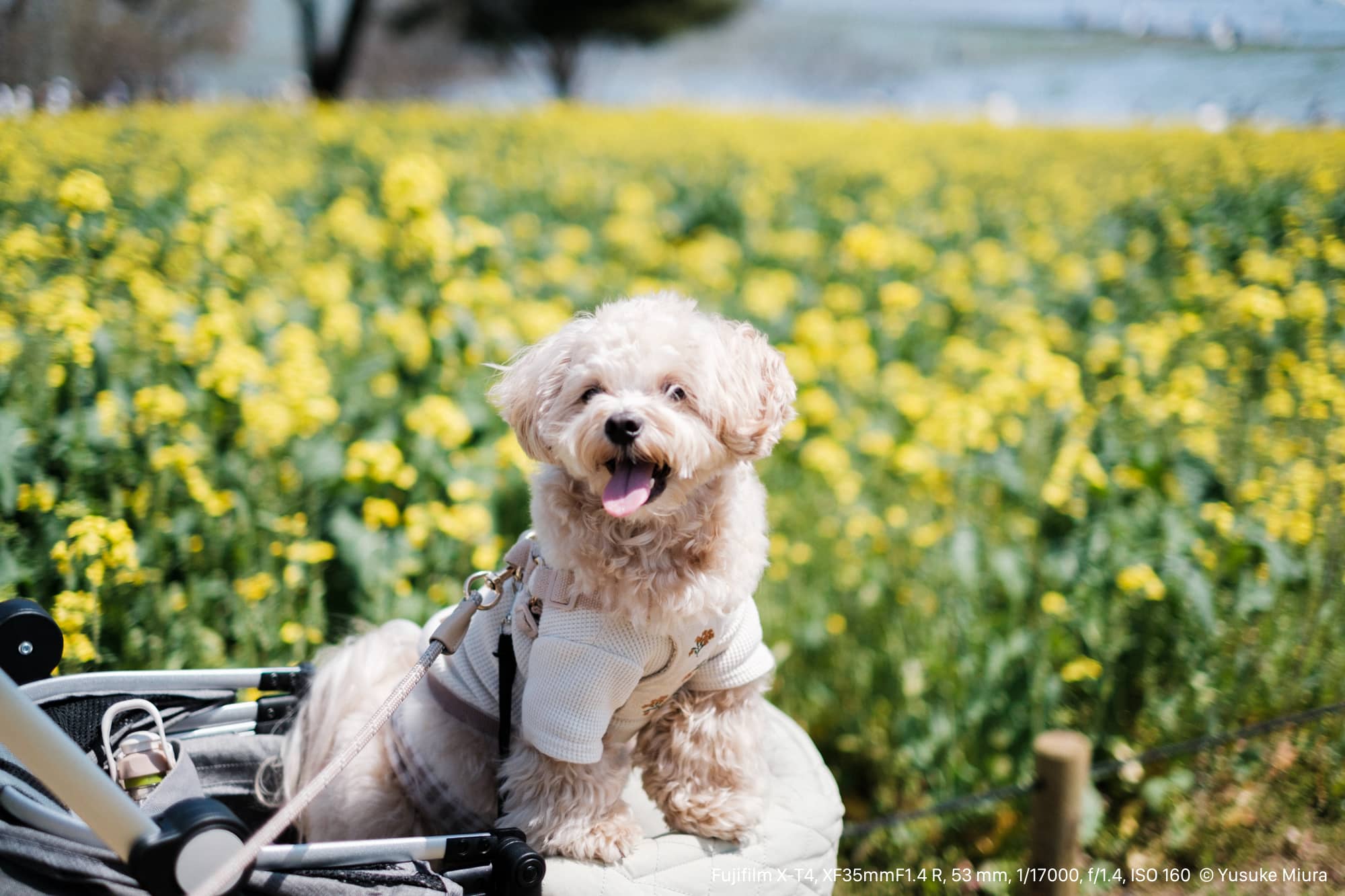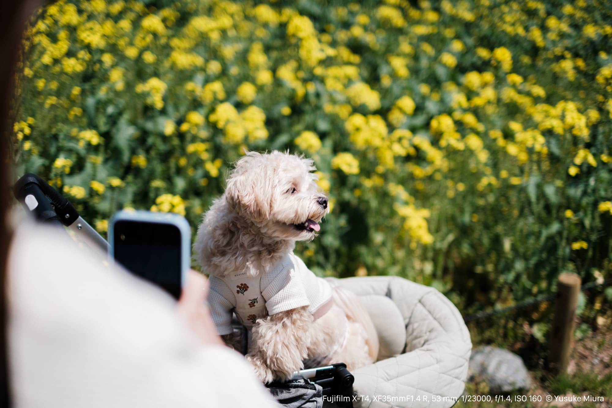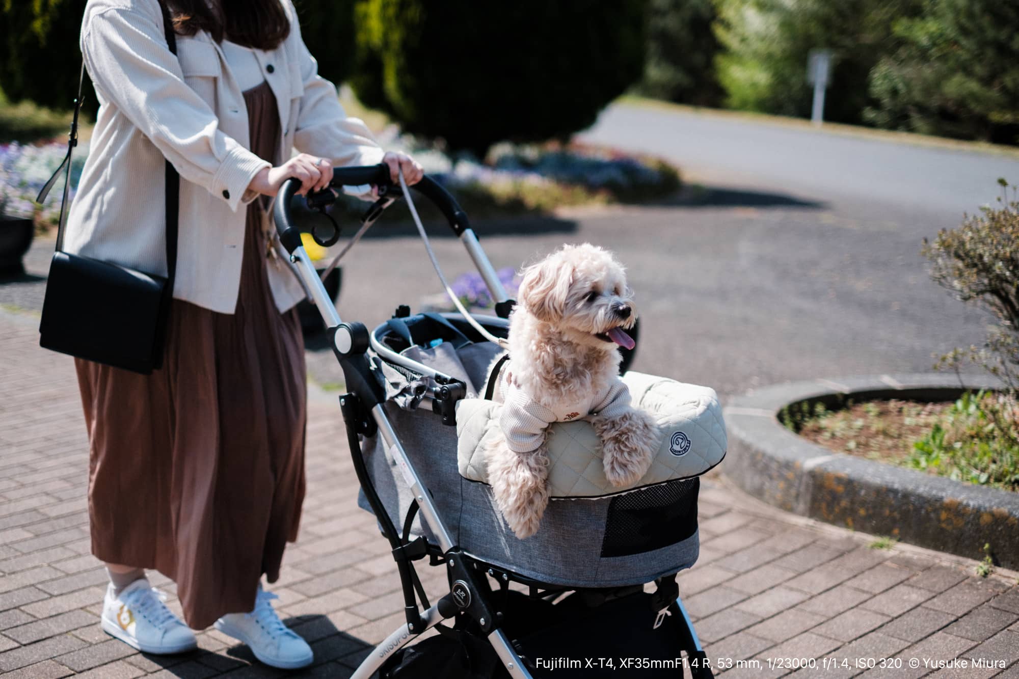 いつものように犬を連れて行きましたが、この時点で既に楽しそう。うちの犬は変わっていて歩くのはあまり好きではないみたいで、すぐにカートに乗せろと言ってくるんです。いい身分だねえ。
