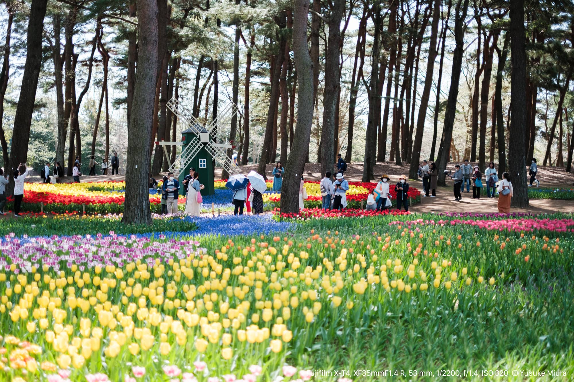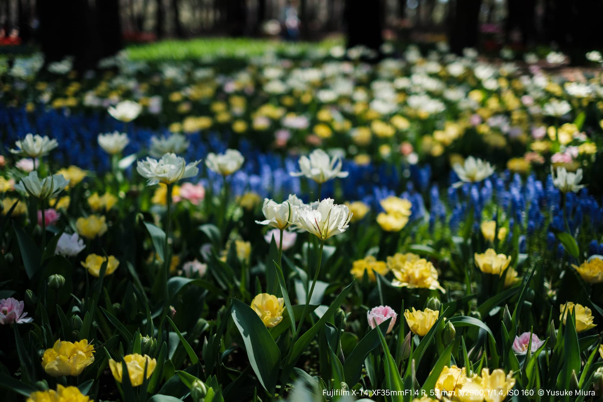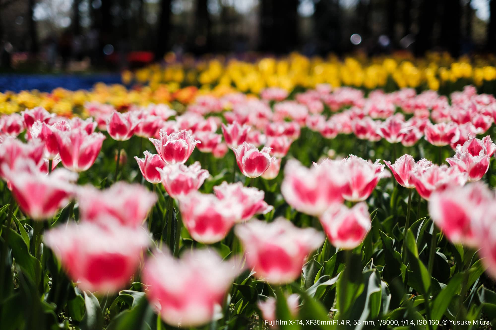 だんだん近づいてくると、何種類もの色鮮やかなチューリップが目に飛び込んできます。新しく買ったばかりのレンズのテストも兼ねて、たくさん写真を撮りました。