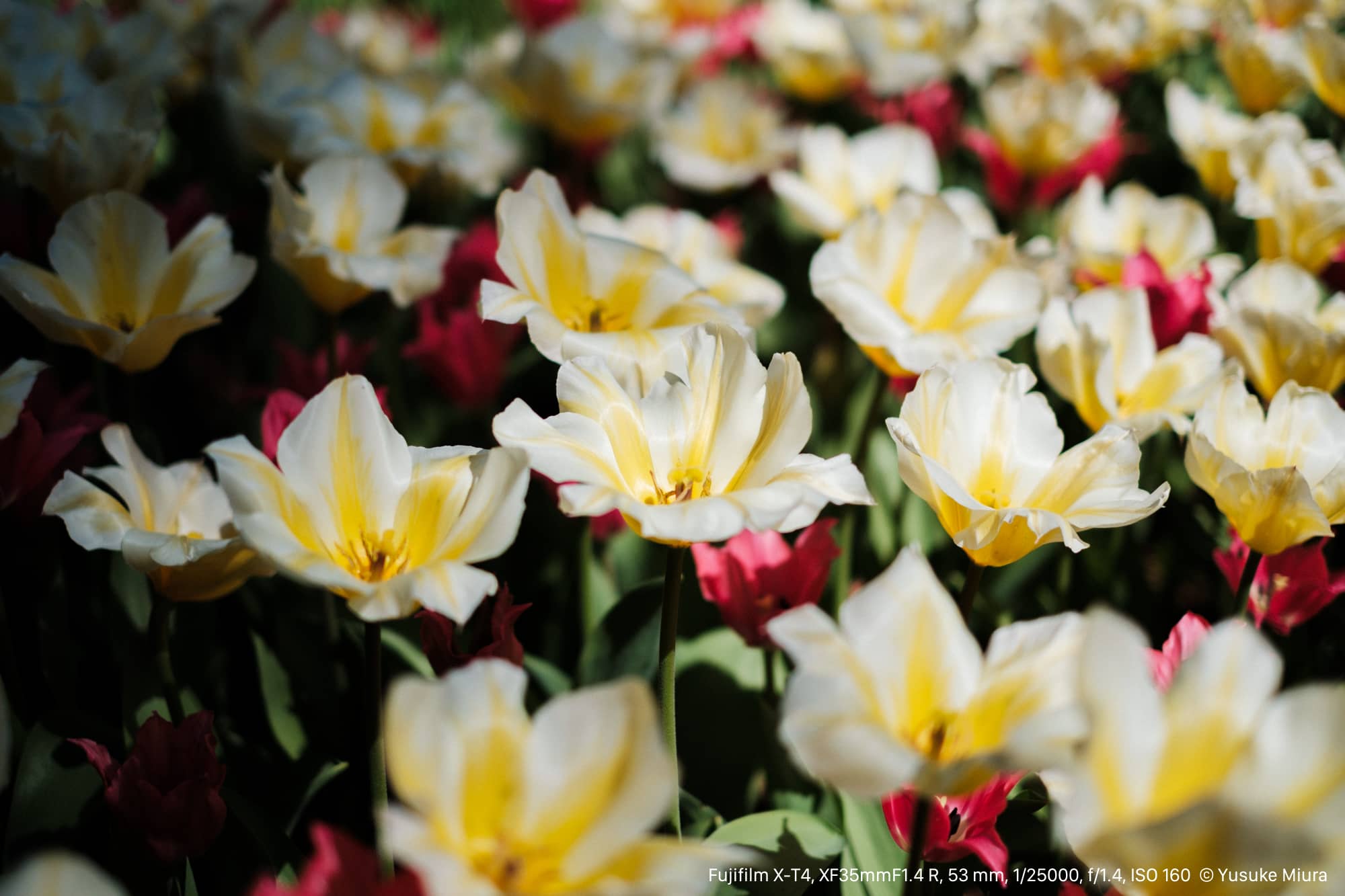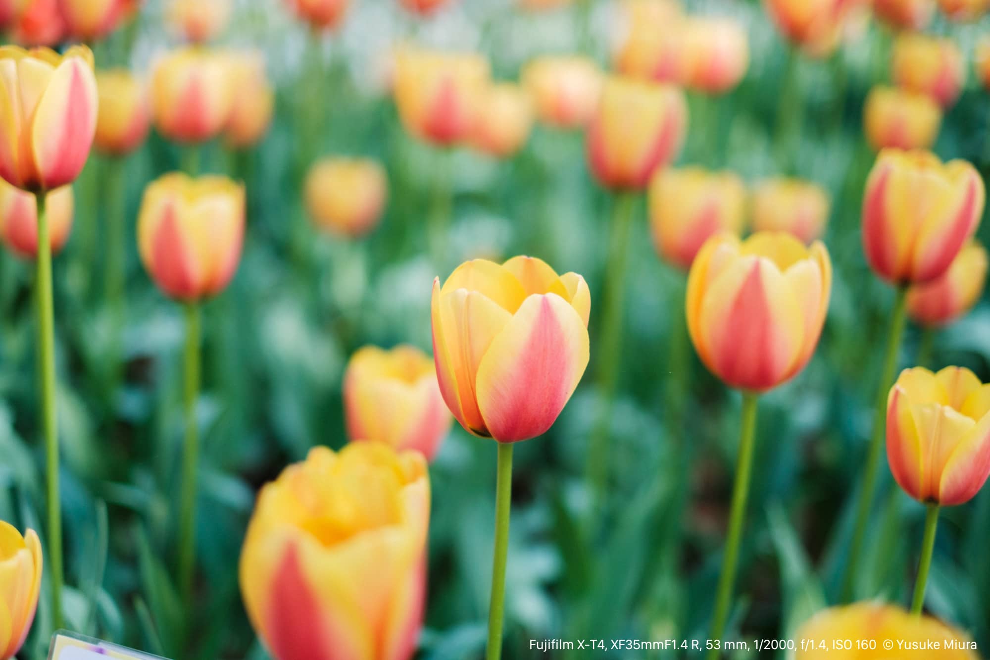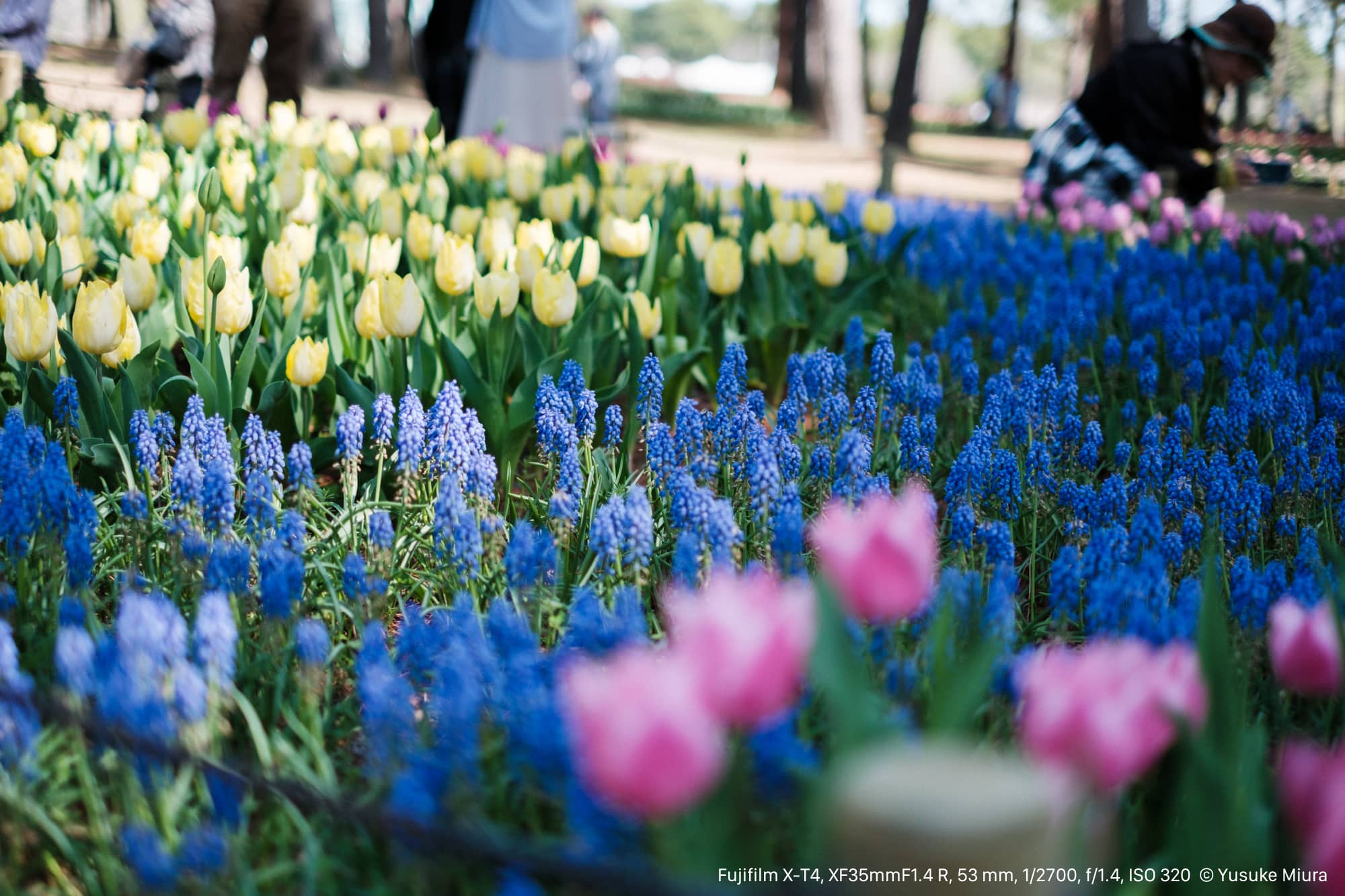 だんだん近づいてくると、何種類もの色鮮やかなチューリップが目に飛び込んできます。新しく買ったばかりのレンズのテストも兼ねて、たくさん写真を撮りました。