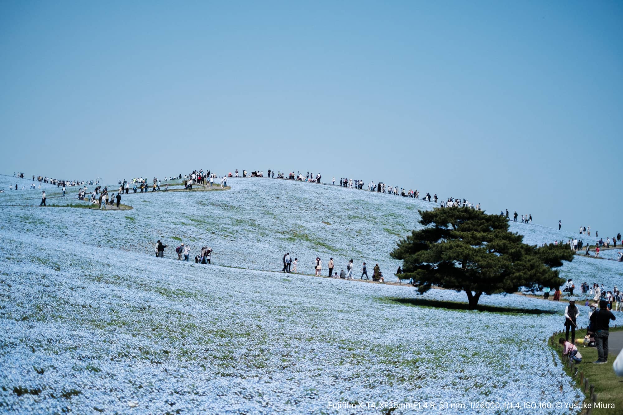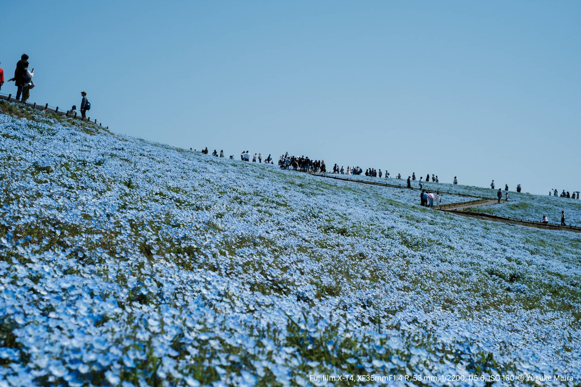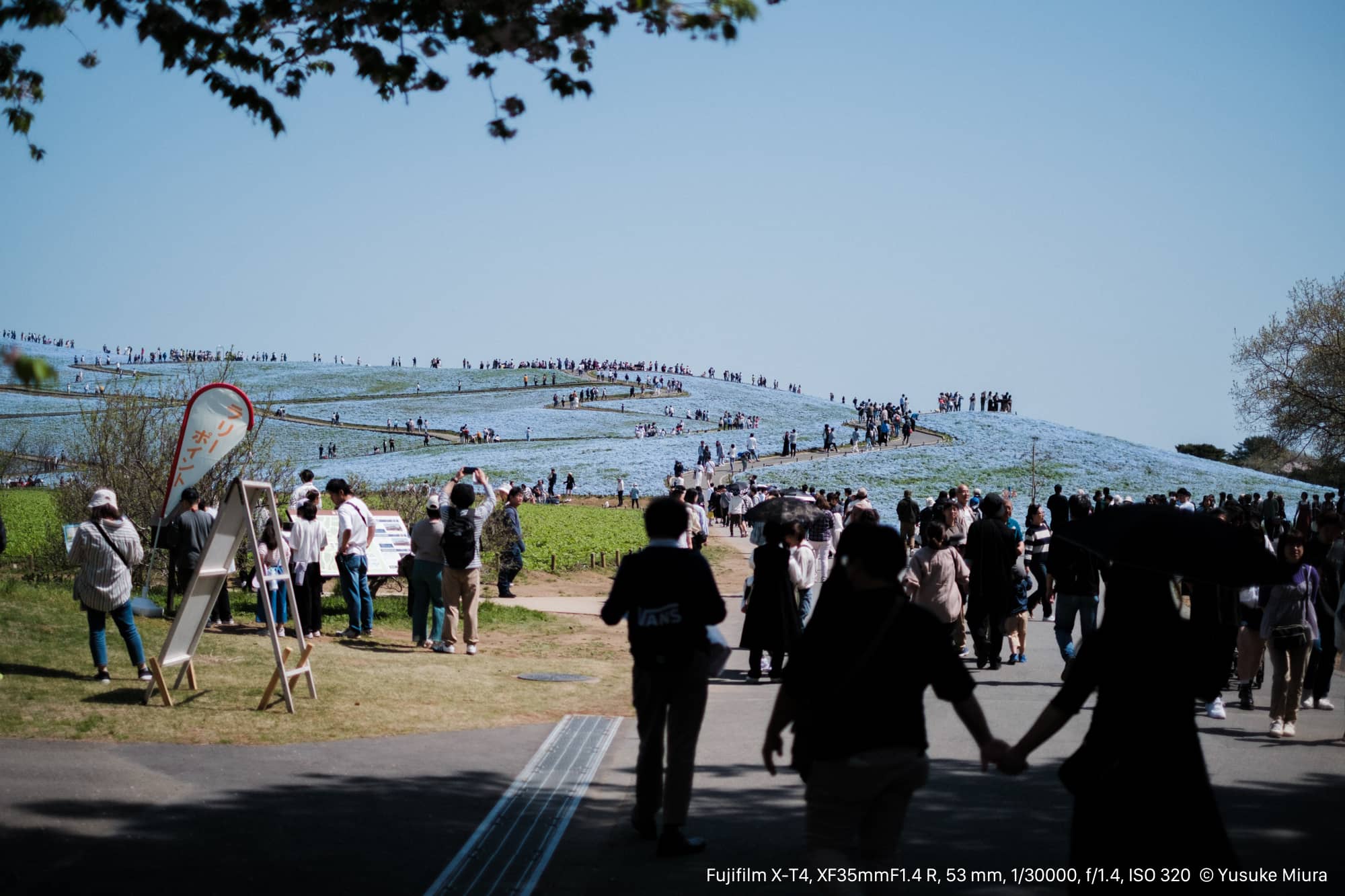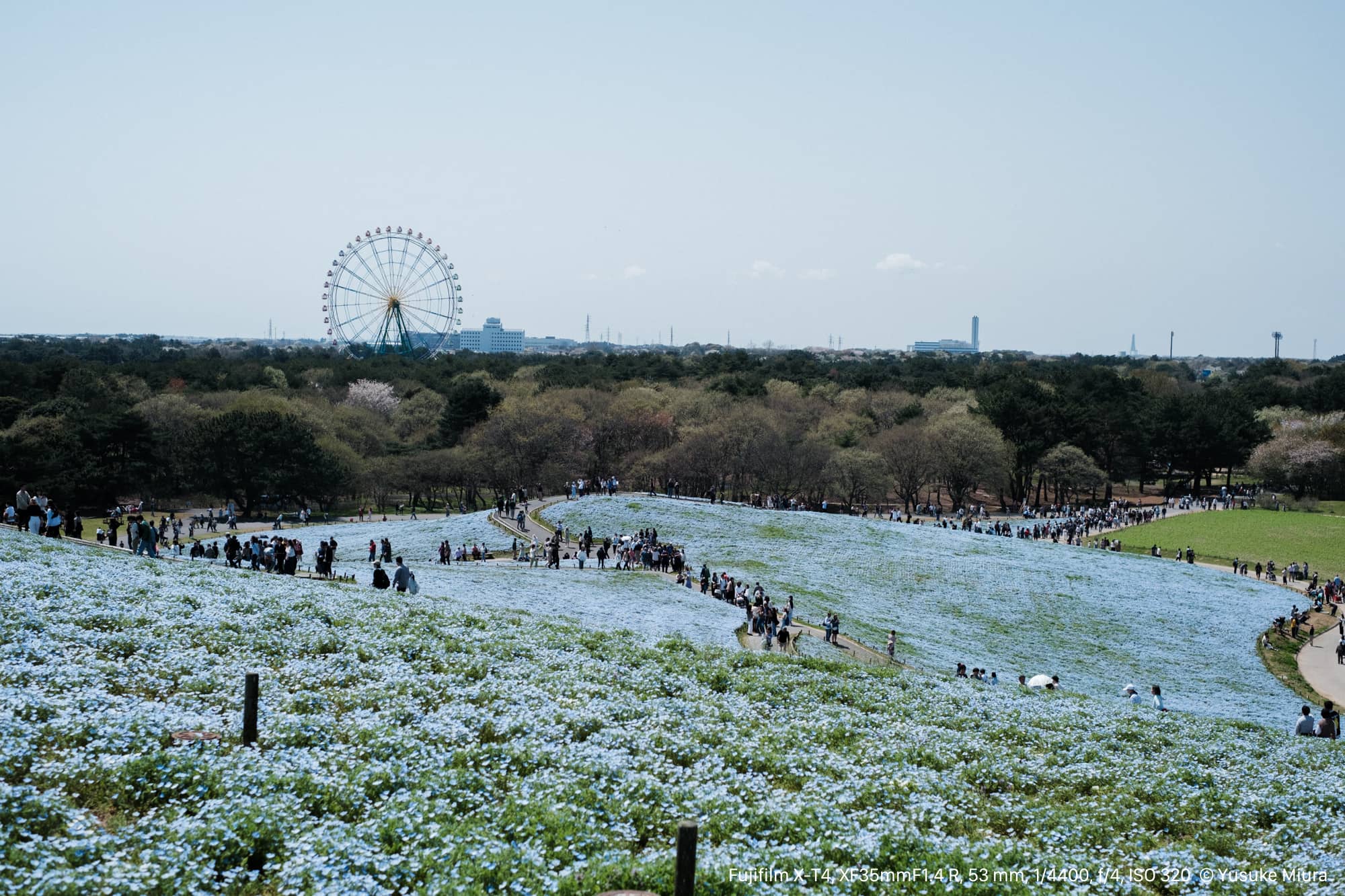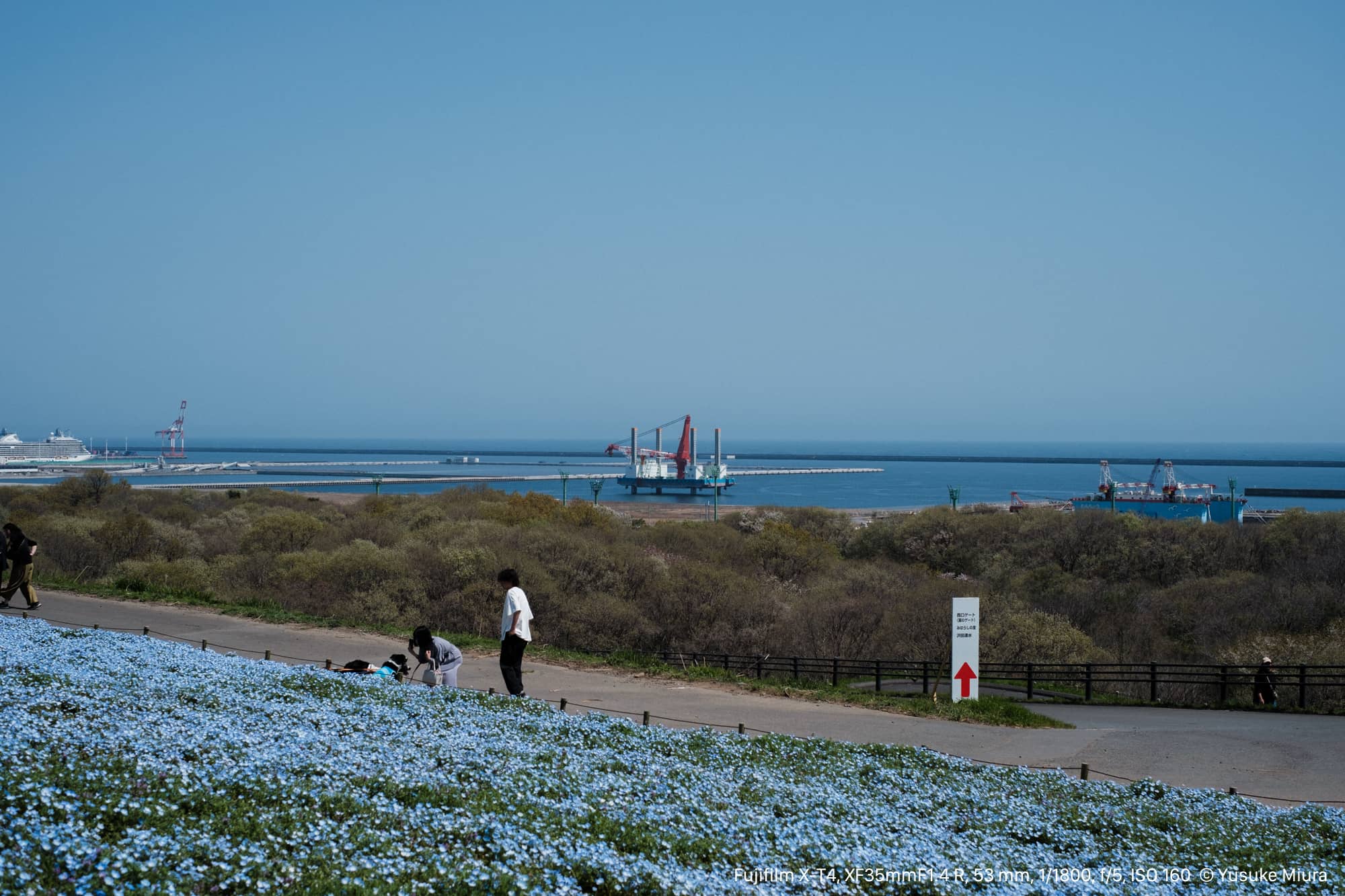さて、ここからは散歩しながらネモフィラの写真を撮りまくります。このために来たようなものだから、後悔のないように心が動いた景色は全てカメラに収めていきます。新しく迎えたレンズの本領発揮です。