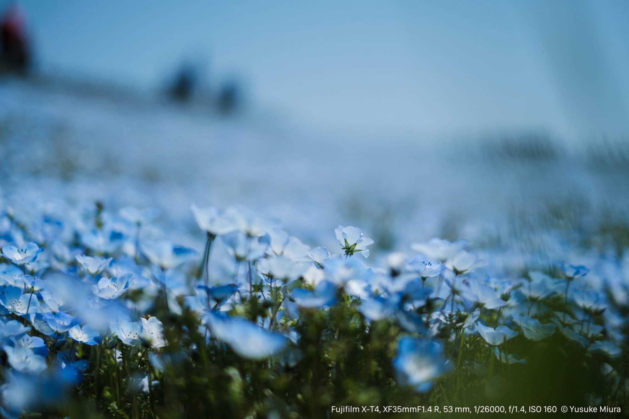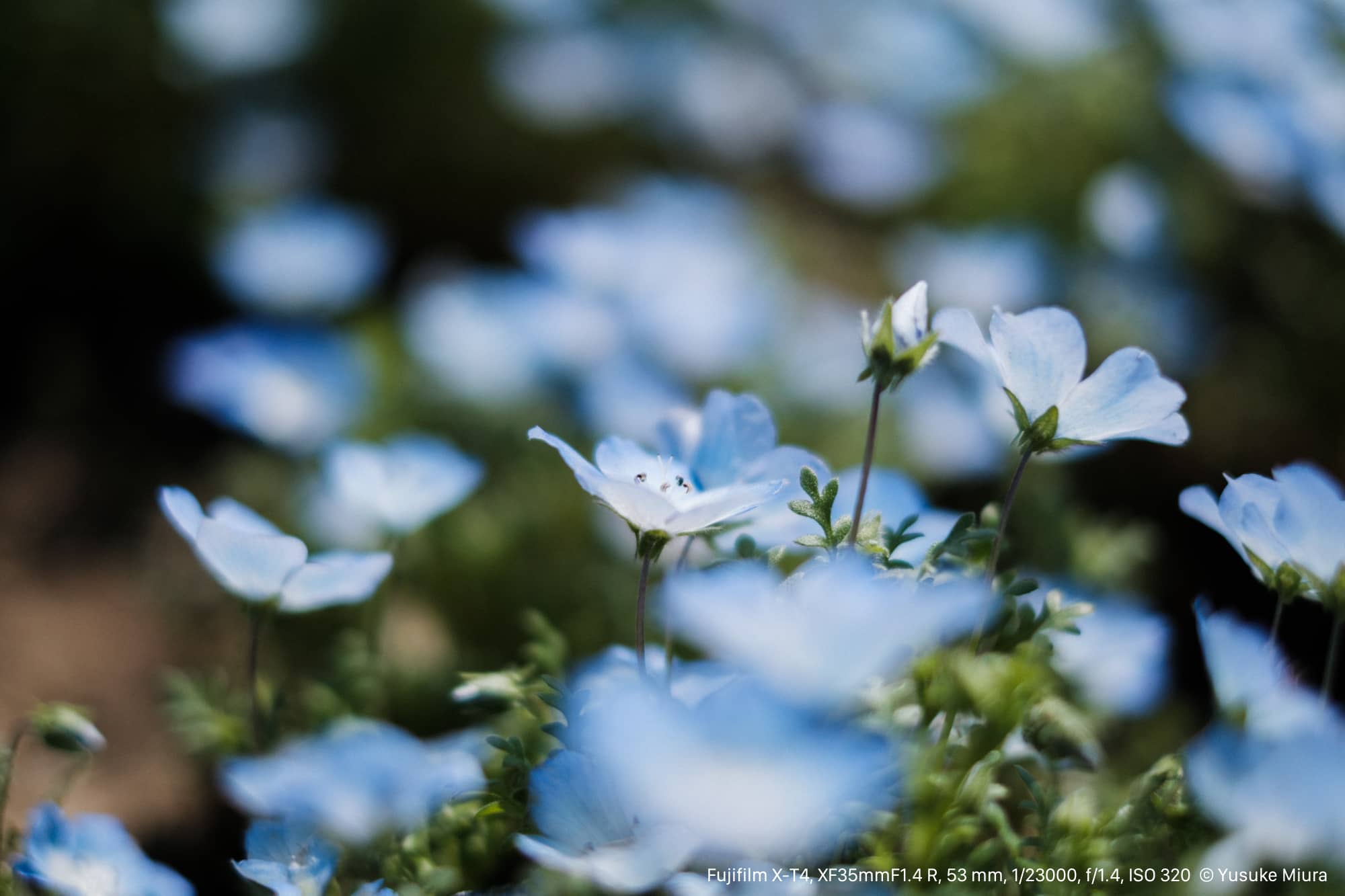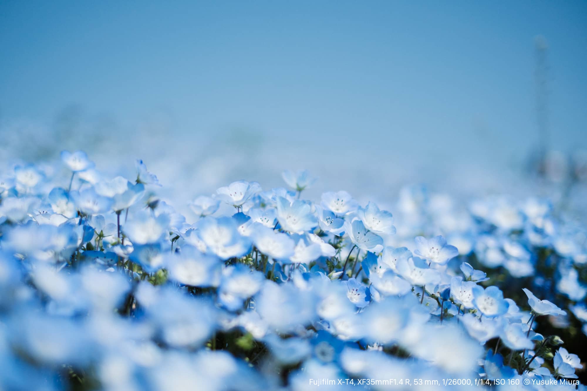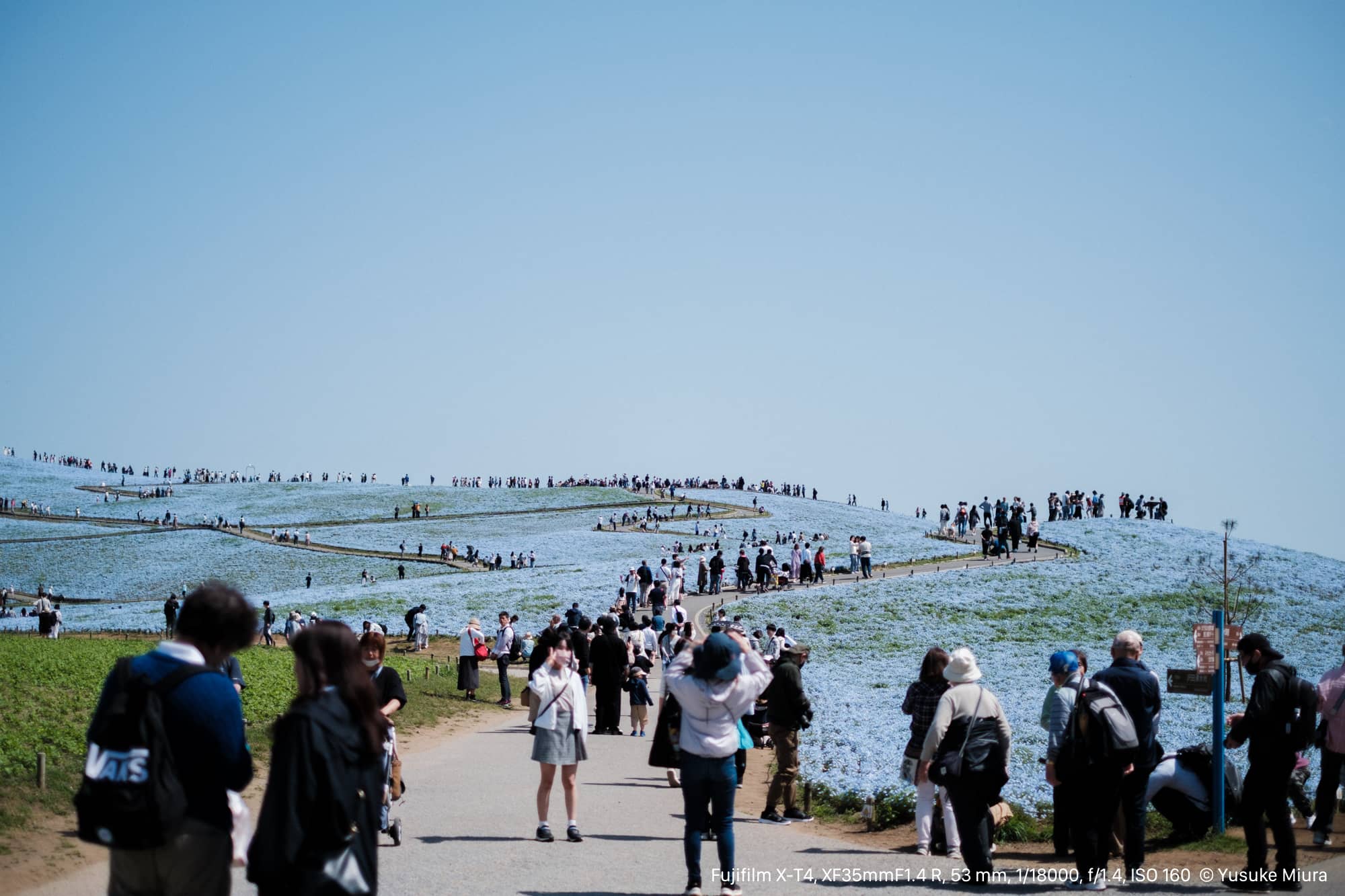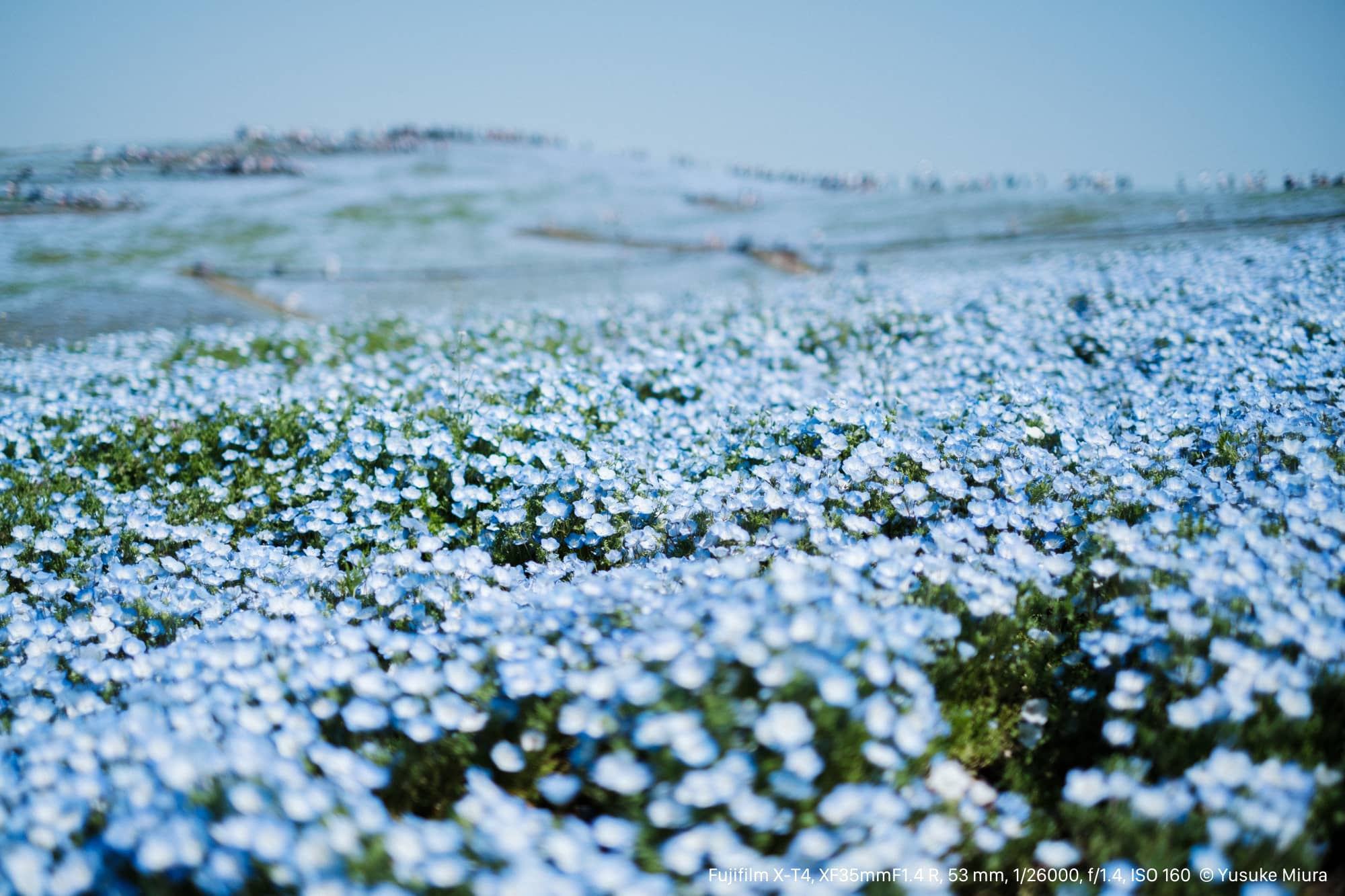 さて、ここからは散歩しながらネモフィラの写真を撮りまくります。このために来たようなものだから、後悔のないように心が動いた景色は全てカメラに収めていきます。新しく迎えたレンズの本領発揮です。