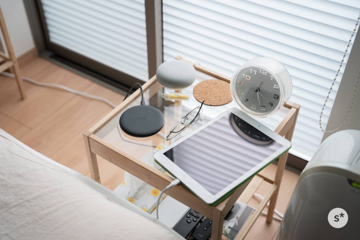 あとは、お決まりのワイヤレス充電器。眠りに落ちる前の最後の力を振り絞ってLightningケーブルをつなぐのはしんどいので、置くだけで充電できるのは助かります。