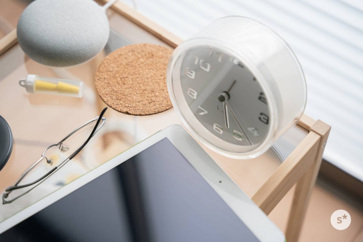 時計は高校生の頃(15年前くらい)に買ったもので、ずっと使っています。アラームはGoogle Home MiniとiPadにしているので、時間を確認するためだけに置いています。秒針がなくて静かなのでお気に入り。