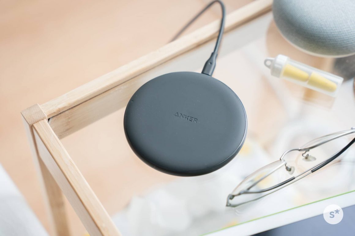 使っているのは、Ankerの「PowerWave 10 Pad」。デザインもシンプルでインテリアを邪魔しないし、表面はラバー加工されていてiPhoneがずれることもないし、気に入っています。