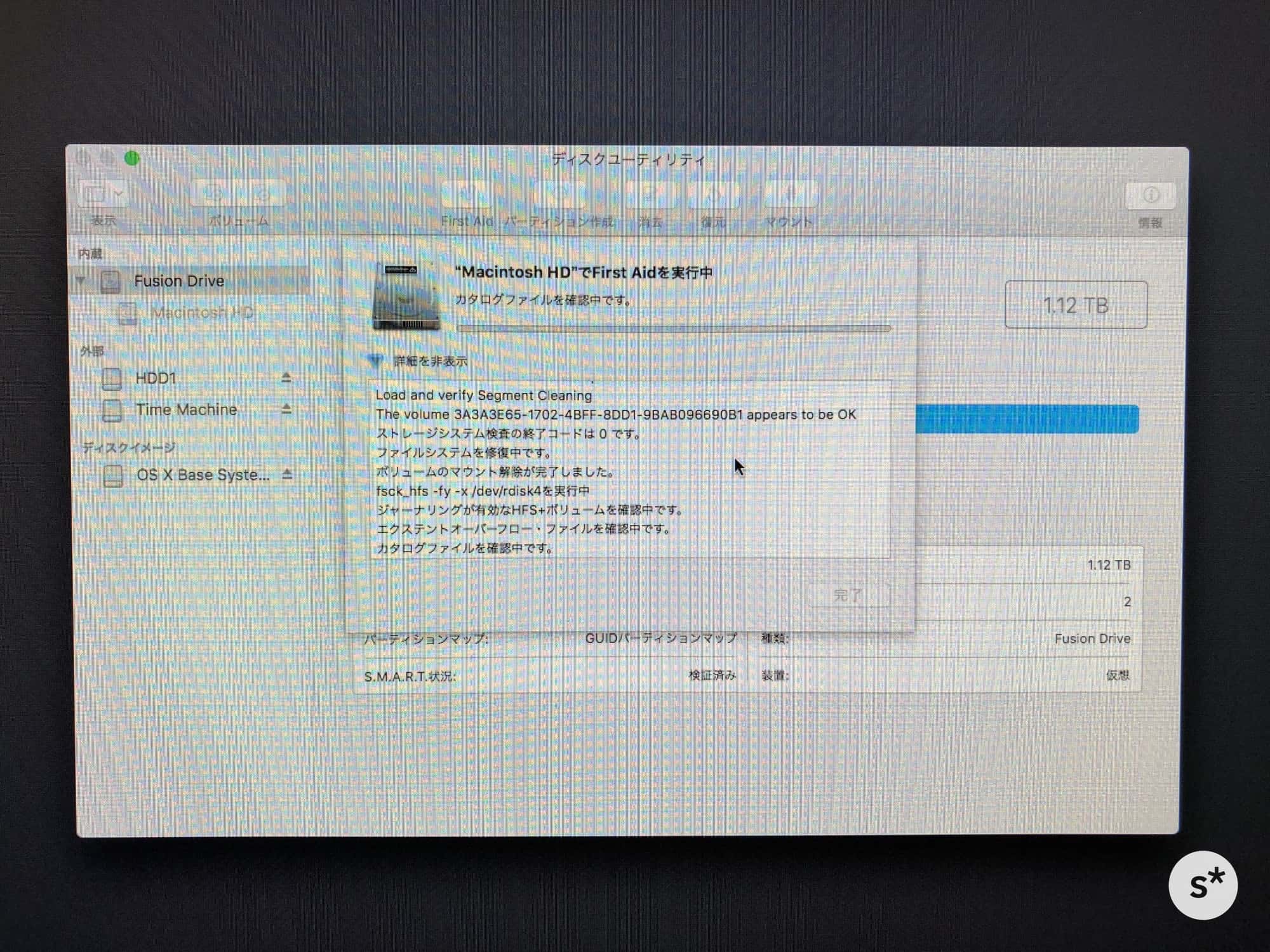 とはいえ、動作が重くなるという症状を考慮すると、HDD(僕のiMacの場合はFusion Drive)まわりがいちばん怪しい。なので、まずはディスクユーティリティから「First Aid」を実行することに。
