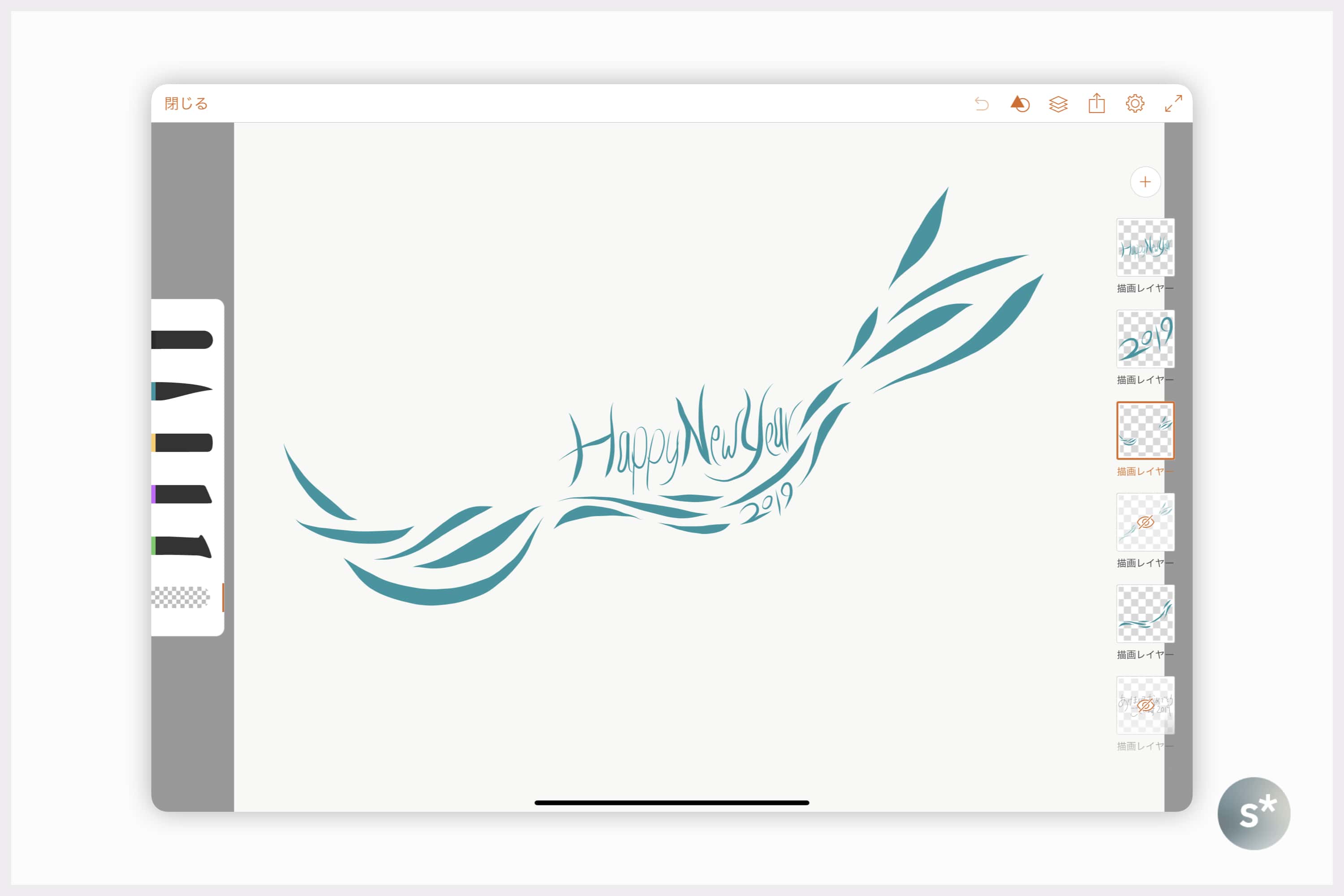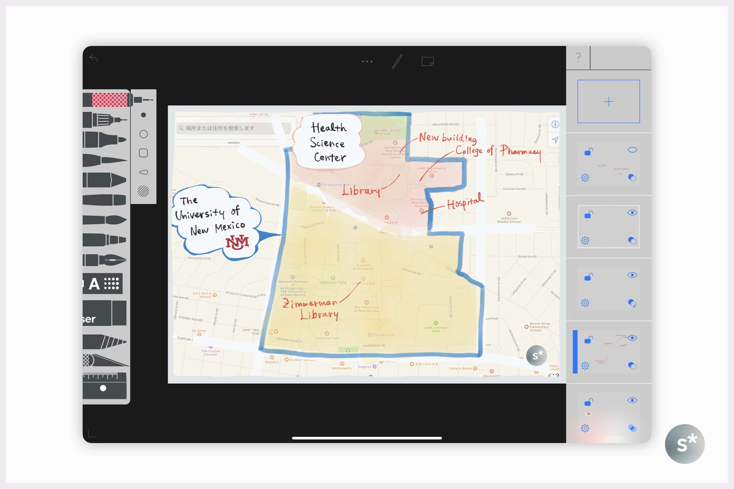 ペンの種類も豊富で、シャープペンシル、ボールペン、マーカー、筆など、場面に合わせて使い分けることができます。必要に応じてレイヤーを分けることもできます。