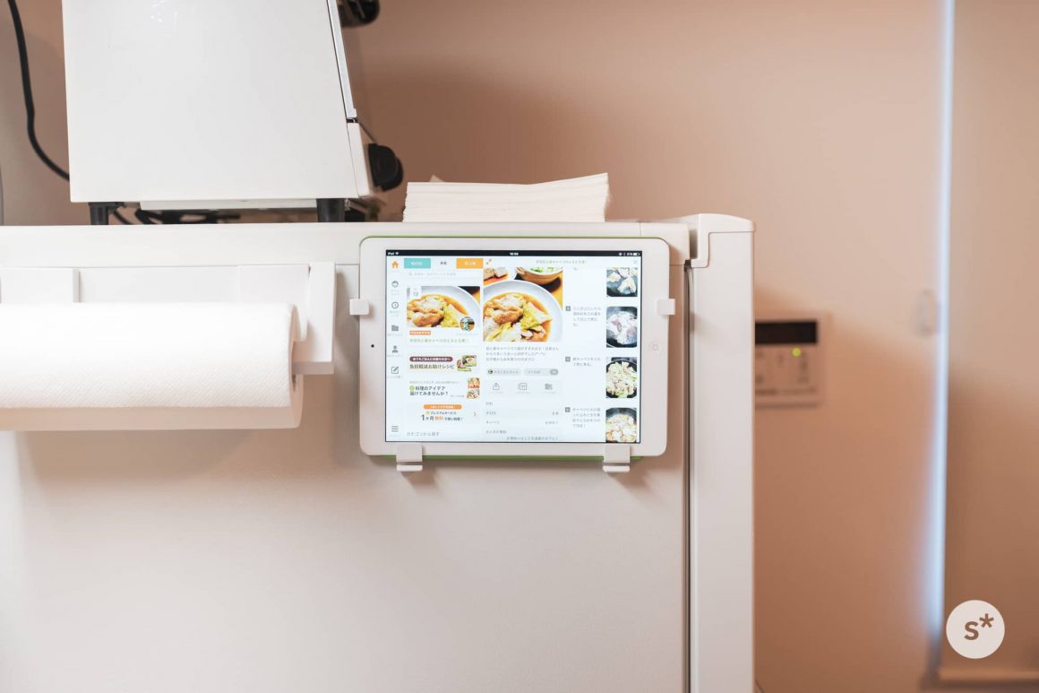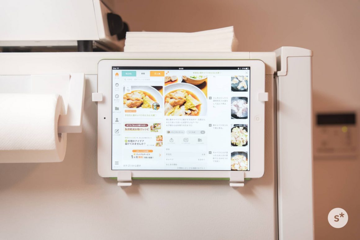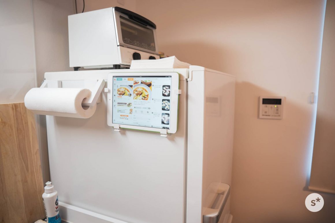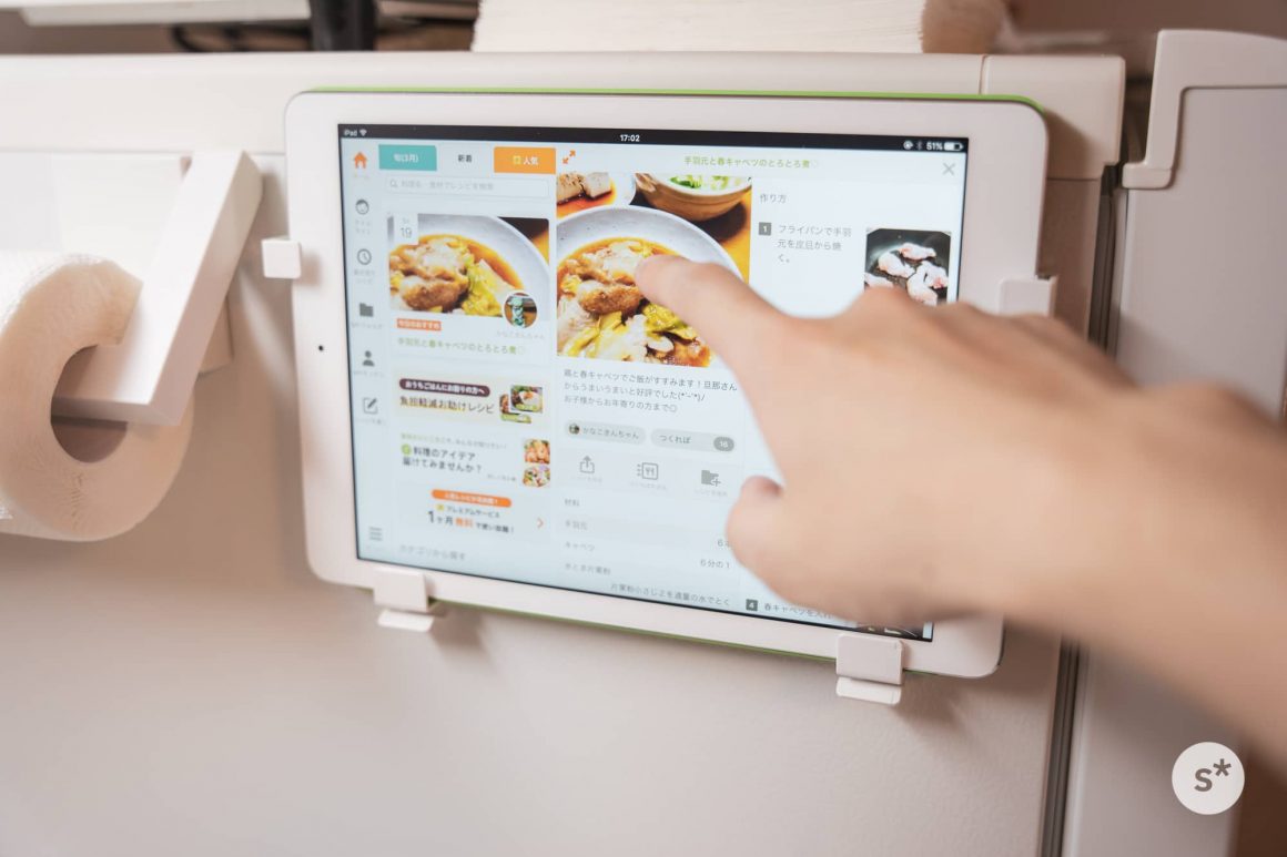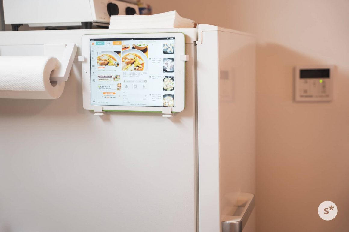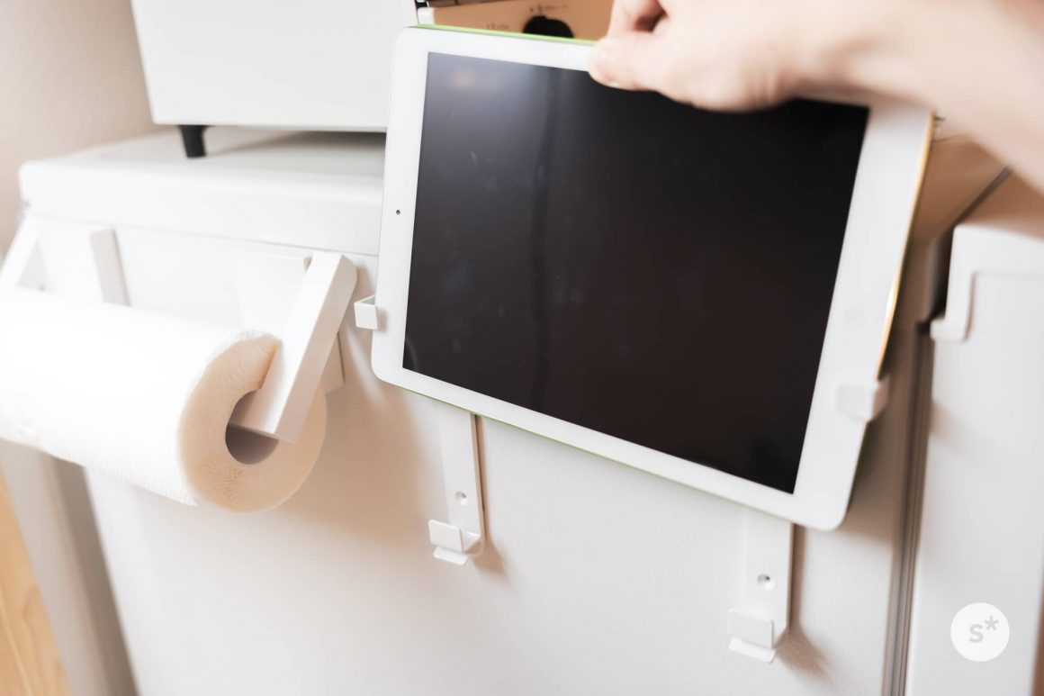 箱から出して貼り付けるだけ、という超簡単なホルダー。レシピを見るだけでなくて、動画や音楽を流しながら料理をしたいときにもちょうどいいです。