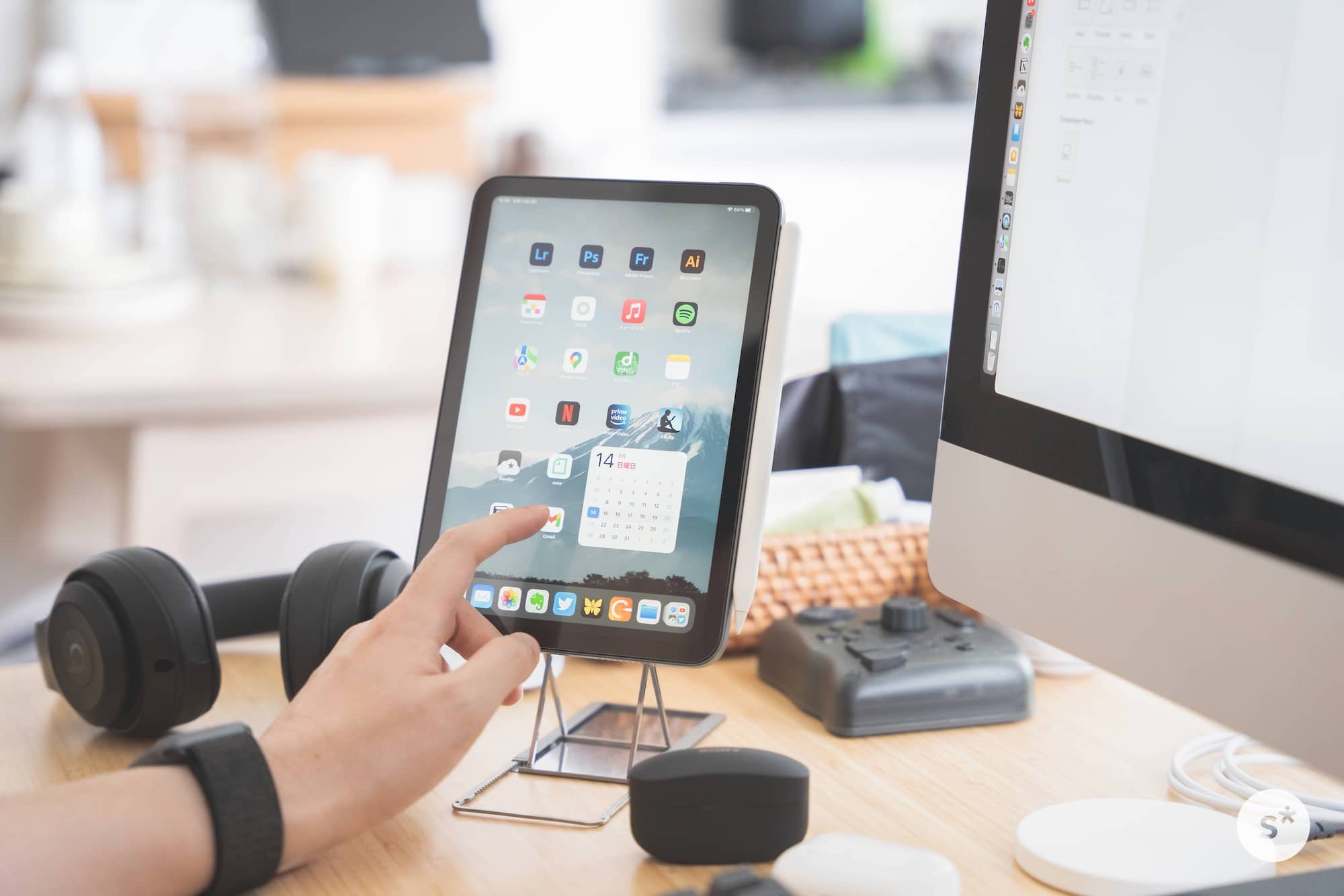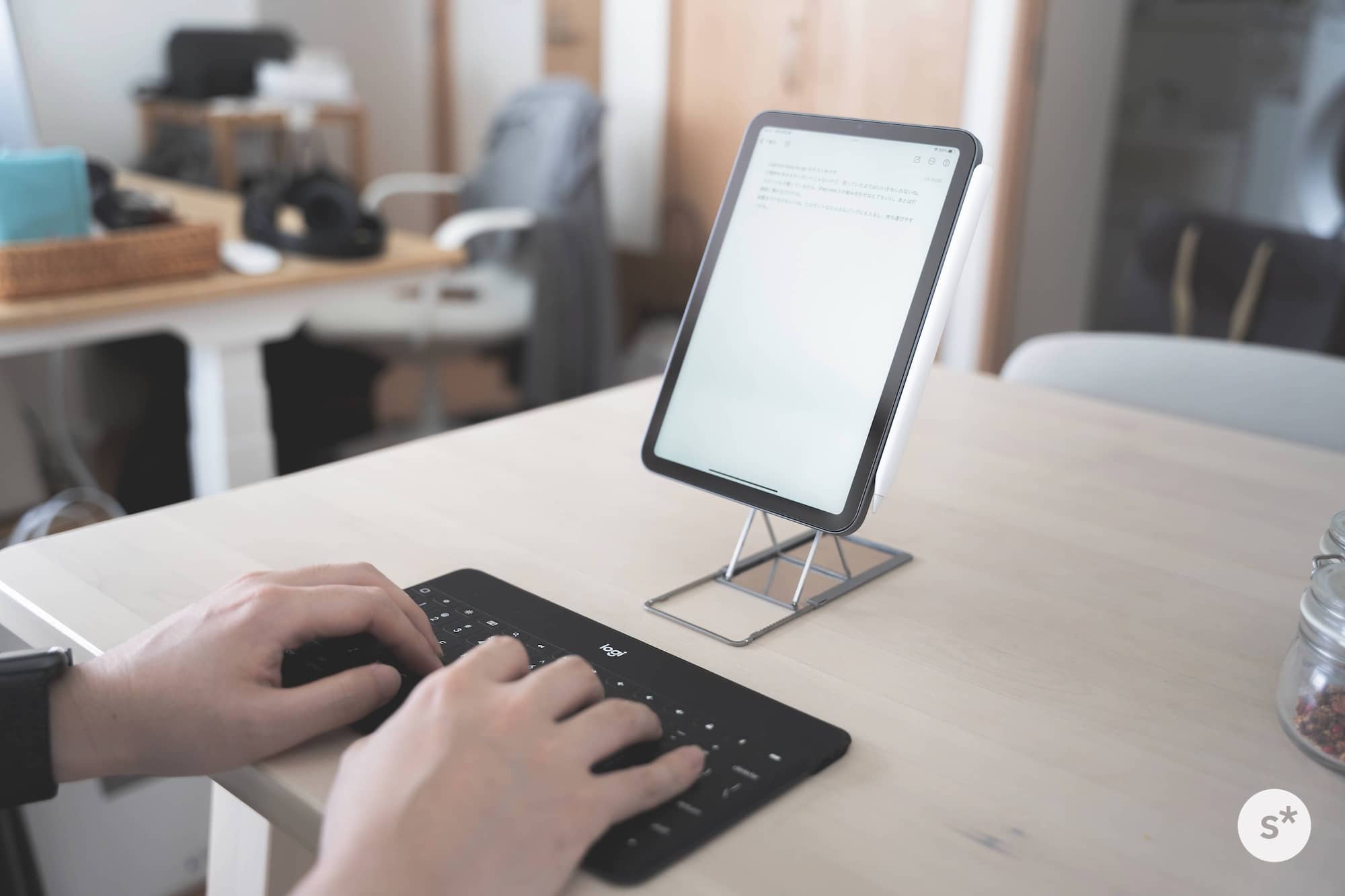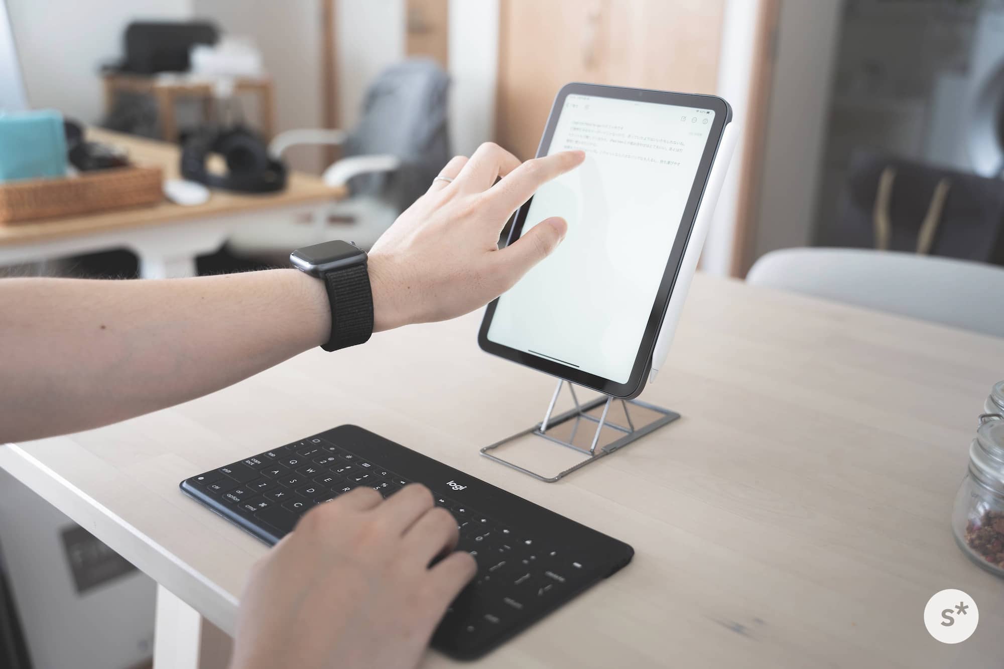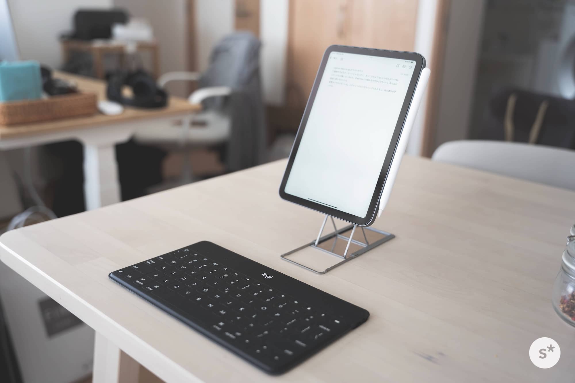 また、iPad mini 6は他のモデルと比べて画面が小さいので、スタンドで立てたときに高さが出ません。机上にある他のデバイスからの視線移動を少なくしたかったので、画面が浮いて高さが出るスタンドがよかったのです。