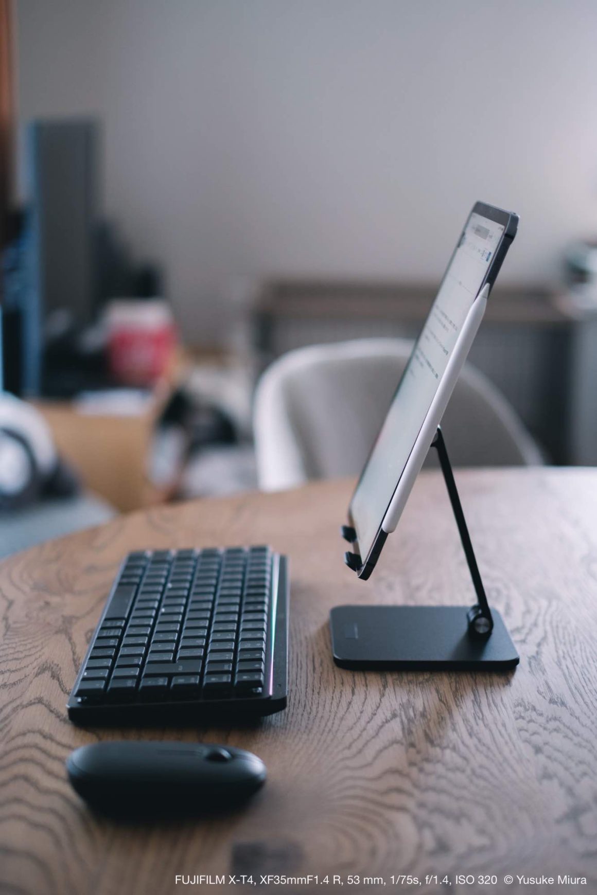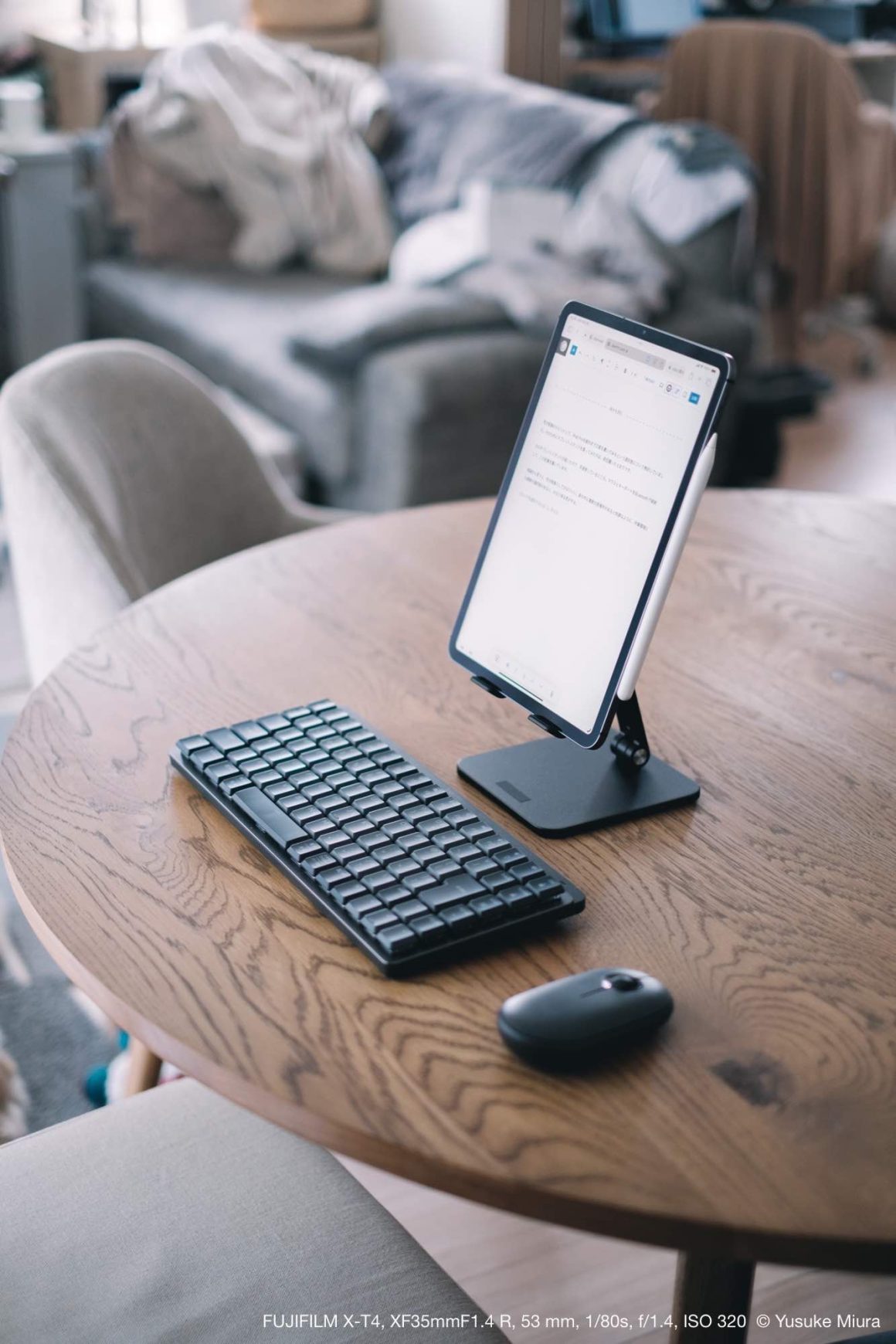 そしてさらに、iPadをスタンドに乗せることによって大きく目線が上がります。縦向きで使っているのと相まって、テーブルの上に置くとちょうど目線の正面に画面がきます。これ、実際にやってみるまでちゃんとイメージついていなかったのですが、声を大にしておすすめしたい。