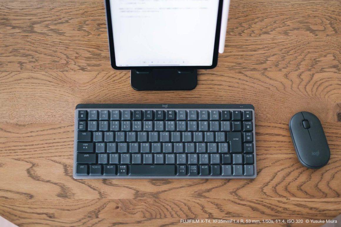 そして、キーボードは先日購入したLogicool MX Mechanical Miniを持ってきました。これ、普段はデスクに置いていて、気分によってHHKBと使い分けています。3台まで切り替えてペアリングできるので、1台目はiMac、2台目としてこのiPad Pro、3台目はまだ空けている感じ。