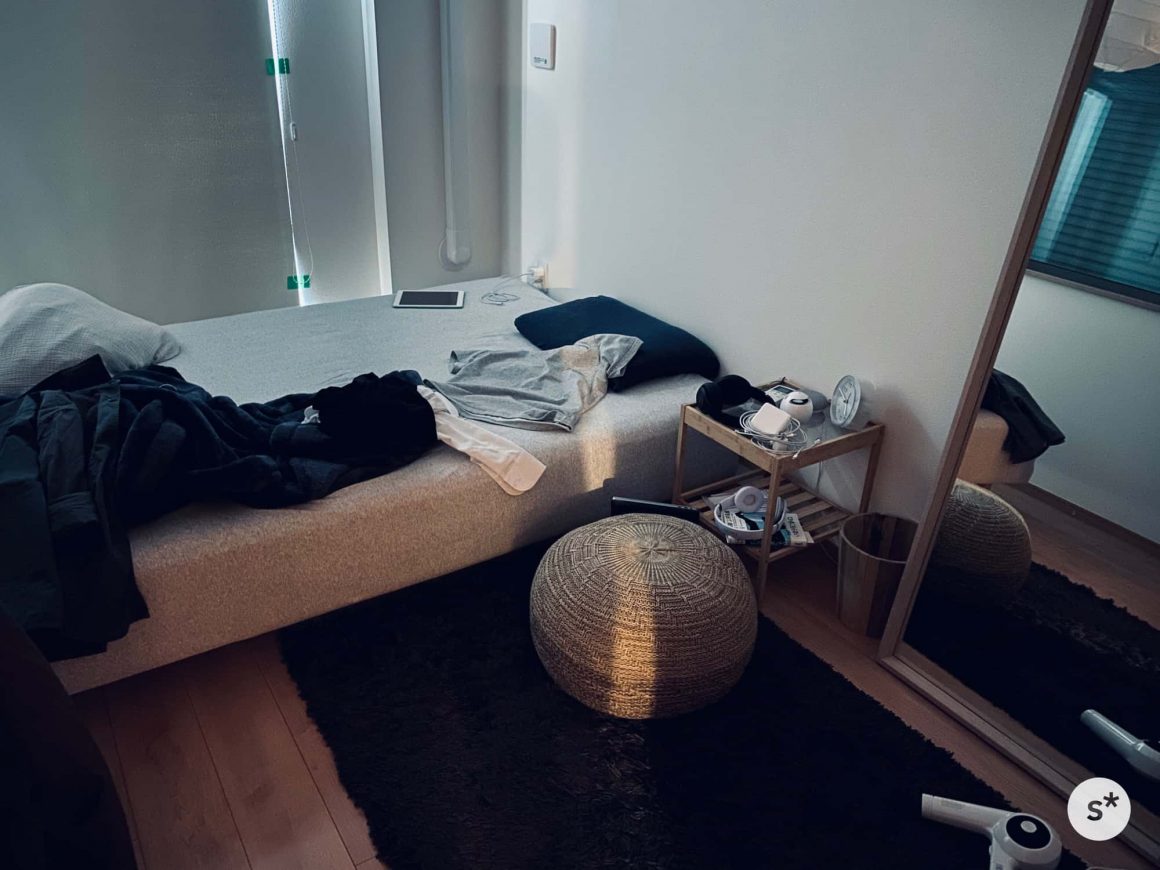 肉眼では真っ暗にしか見えない寝室を、ナイトモードで。散らかってるのは許して。