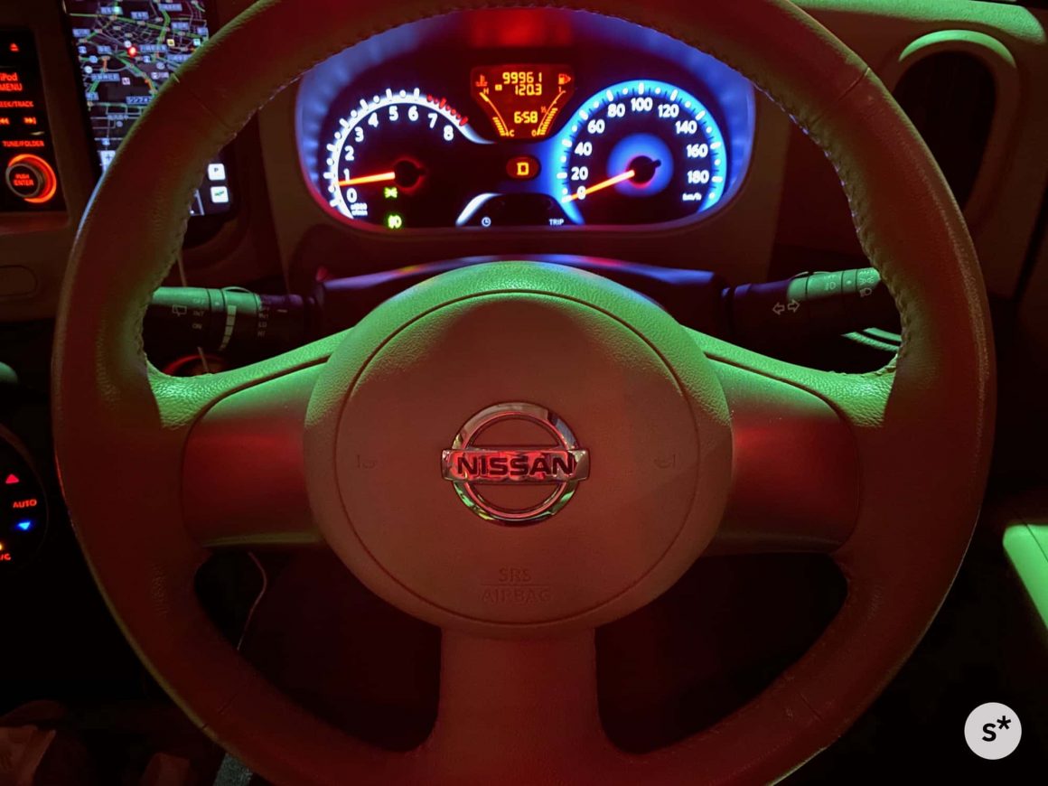 車のステアリングホイール。これもナイトモードですが、光っているメーター部分が白飛びしてないのはすごい。