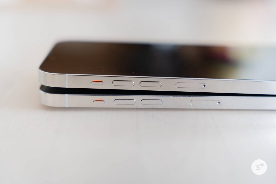 一方、本体左側のミュートスイッチ、音量ボタン、SIMトレイは、全体的に上に移動しました。ミュートスイッチと音量ボタンは微妙な差ですが、よく見ると数ミリ移動しています。